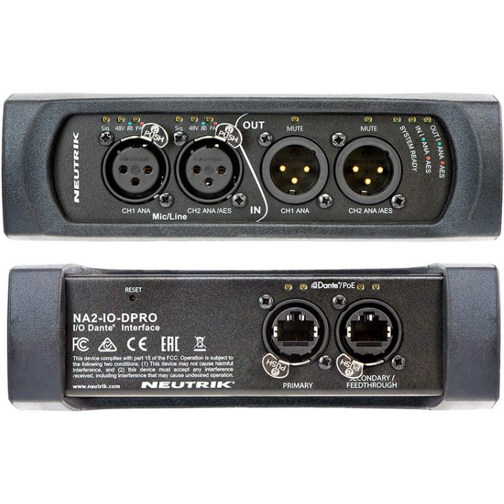 Neutrik NA2-IO-DLINE – аналоговый/Dante интерфейс, позволяющий подключить аналоговые устройства в сеть Dante. Блок предлагает по два балансных входа и выхода XLR, которые позволяют интегрировать два аналоговых канала аудио в сеть Dante, а также преобразовать поток Dante в пару аналоговых сигналов. При этом можно одновременно подавать и передавать аналоговые/Dante сигналы: сразу направлять аналоговые сигналы в сеть Dante и микс из другого источника Dante в аналоговое оборудование, например, усилители, акустические системы или микшеры. Интерфейс предназначен для сложных условий эксплуатации. Поэтому предусмотрены блокируемые разъемы для аудио и сетевых соединений. Для стационарных инсталляций защитный резиновый кожух можно снять. С опциональными монтажными кронштейнами или рэковой панелью можно установить блок на стол, в стойку или напольный бокс. Особенности модели Neutrik NA2-IO-DLINE: Подключение аналогового аудиооборудования к сети Dante. Кожух для сложных условий эксплуатации. Аудио и сетевые подключения с блокировкой. Преобразование до двух аналоговых линейных сигналов в сеть Dante. Возможно подключения не поддерживающих Dante усилителей, акустических систем или микшеров к сети Dante. AES67-совместимый. Для использования в сетях AOIP AES6 требуется коммутатор Power over Ethernet либо PoE Injector (802.3 af/at, класс 1). Возможна установка в рэк.