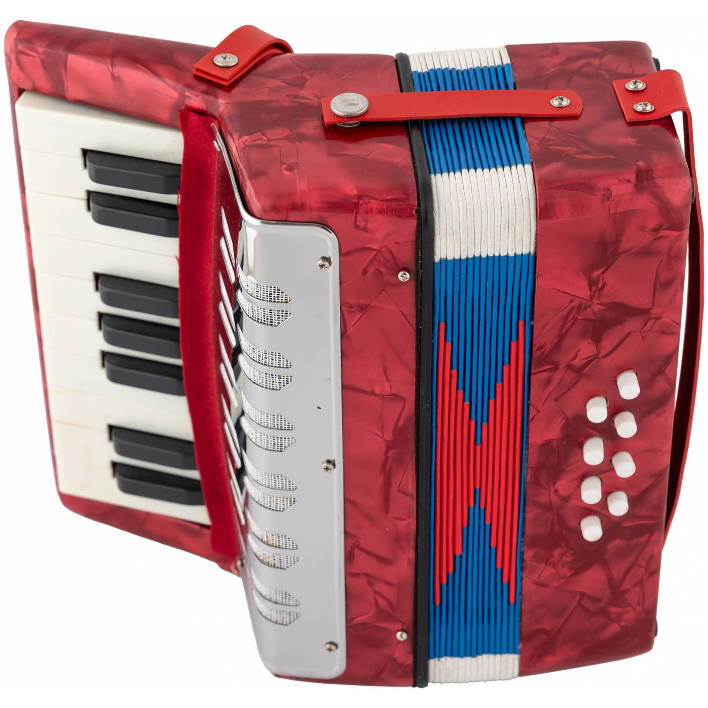 Это компактная гармошка, которая отлично подойдет для музыкального развития и развлечения самых маленьких. Ее корпус изготовлен из прочного и безопасного пластика и оснащен 17 клавишами для правой руки и 8 кнопками для левой. Инструмент имеет небольшой размер и яркий дизайн в красном цвете.