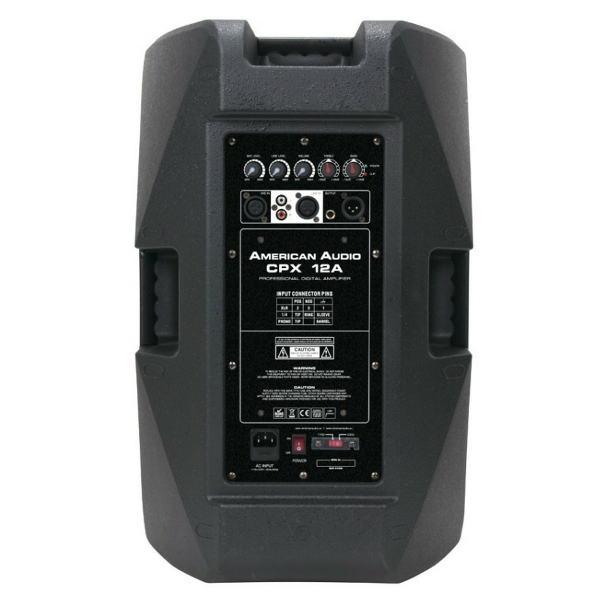 American DJ CPX 12A - 2-полосный динамик с высокоэффективным усилителем класса D. Имеет встроенный двунаправленный усилитель мощностью 500 Вт, синхронизированный по времени электронный кроссовер, 5 монтажных точек M8. Есть возможность монтажа на штативе. Защита от отсечения и перегрева предусмотрена.