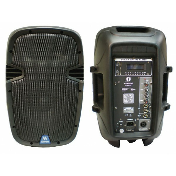 Легкая и компактная акустическая система AudioVoice AP210D оснащена усилителем D class, с интерфейсами для подключения USB Flash и SD карт, система имеет также выход для подключения дополнительной акустической системы (пассивная, минимальное сопротивление 8 Ом, Speacon). Пользователю доступны регулировки громкости и чувствительности, уровня высоких и низких частот. Для подключения AP210D к микшерным пультам используются симметричный вход под 1/4" стерео джек. Для подключения микрофона есть вход с регулировкой чувствительности под 1/4" джек.