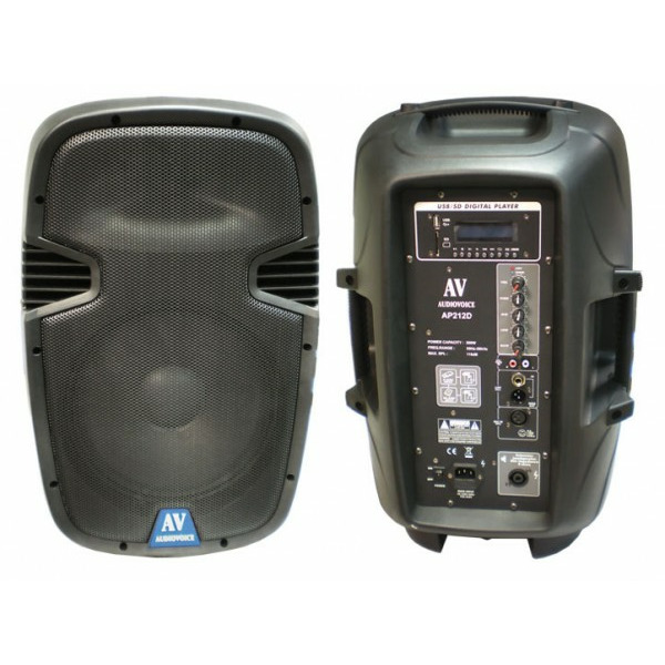 Легкая и компактная акустическая система AudioVoice AP212D оснащена усилителем D class, встроенным MP3 плейером с интерфейсами для подключения USB Flash и SD карт, система имеет также выход для подключения дополнительной акустической системы (пассивная, минимальное сопротивление 8 Ом, Speacon). Пользователю доступны регулировки громкости и чувствительности, уровня высоких, средних и низких частот. Для подключения AP212D к микшерным пультам используются симметричный вход под 1/4" стерео джек, L/R входы RCA, и XLR male для ретрансляции линейного сигнала на другие АС. Для подключения микрофона есть вход XLR с регулировкой чувствительности.