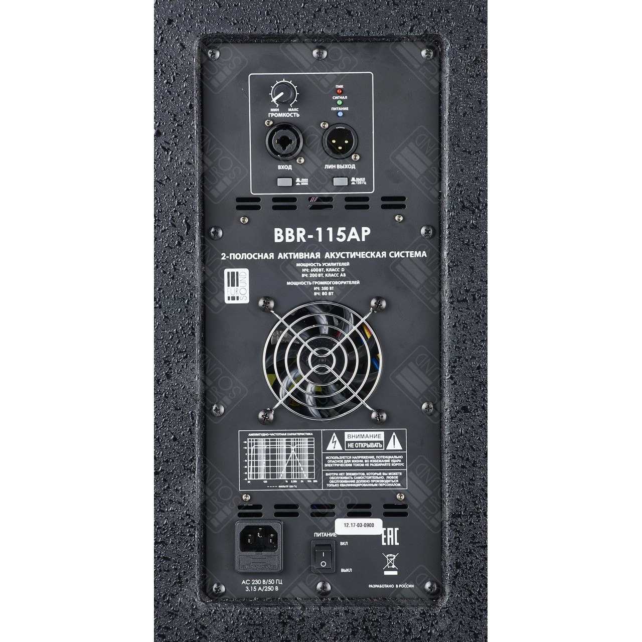 Профессиональная двухполосная активная акустическая система. Серия BBR была спроектирована в России и найдет свое применение в школах, детских садах и домах культуры. Данная модель состоит из 15-ти дюймого низкочастотного динамика и 1.75" компрессионного драйвера, встроенные усилители bi-amp 600+200 ватт. Номинальная выходная мощность акустики 460 ватт. Рабочий частотный диапазон 45-20000 Гц, угол раскрытия 60х45 градусов, уровень звукового давления 132 дБ (1Вт/м). Один линейный/микрофонный вход на комбо-разъеме XLR/6.3 Jack TRS и один сквозной выход XLR. Наличие фильтра 120 Гц для совместной работы с сабвуферами. Есть встроенный стакан 35 мм с двумя углами наклона под стандартную акустическую стойку и 12 точек подвеса для рым-болтов M8. Корпус изготовлен из 18-мм фанеры, покрытой лаком.