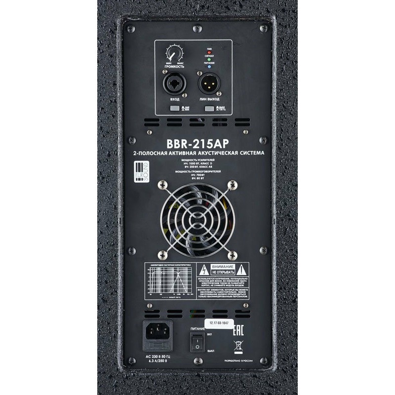 Профессиональная двухполосная активная акустическая система из российской серии BBR (спроектирована в России). Данная модель имеет два встроенных усилителя, которые работают по Bi-amp: НЧ секция -усилитель 1000 ватт класса D, два низкочастотных динамика по 15 дюймов; ВЧ секция - усилитель 200 ватт класса AB и один компрессионный драйвер 1.75 дюймов. Номинальная мощность акустики 780 ватт. Частотный диапазон 45-20000 Гц, дисперсия 60х45 градусов, уровень звукового давления до 134 дБ. Один линейный/микрофонный вход на комбо-разъеме XLR/6.3 Jack TRS и один сквозной выход XLR. Наличие фильтра 120 Гц для совместной работы с сабвуферами. Материал кабинета сделан из фанеры и имеет лакокрасочное покрытие. Размеры: 1080х464х477 мм, вес 33.5 кг.
