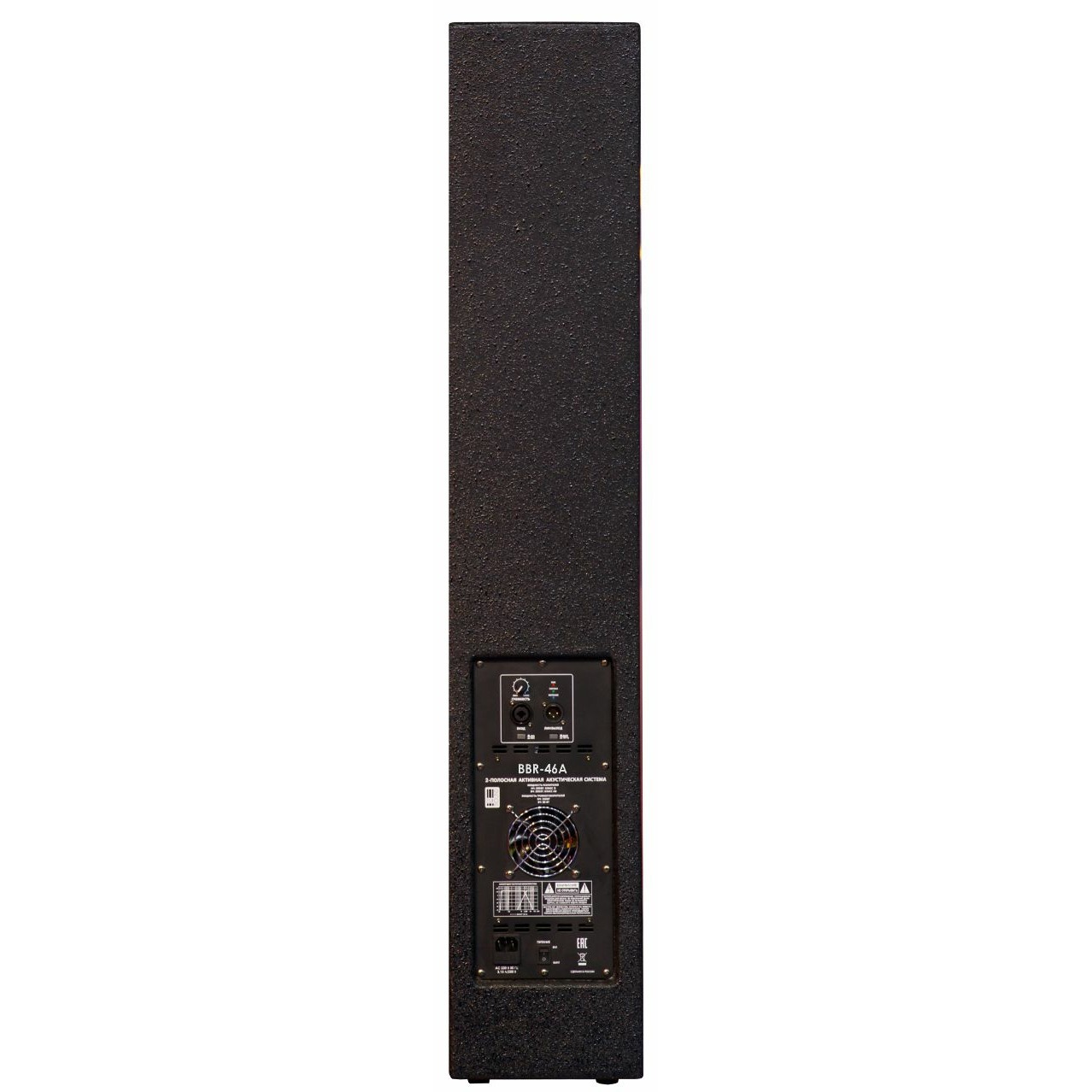 BBR-46A состоит из 4-х НЧ динамиков диаметром 6.5'', расположенных в один ряд и двух ВЧ драйверов с диаметром катушки 1.75''. ВЧ драйверы работают на рупоры специальной конструкции, которые используются в линейных массивах. Именно они играют главную роль в широкой направленности данной АС. Верхний рупор расположен под прямым углом к слушателю, и предназначен для озвучивания дальних зон, а нижний - под небольшим углом, для озвучивания ближних зон.