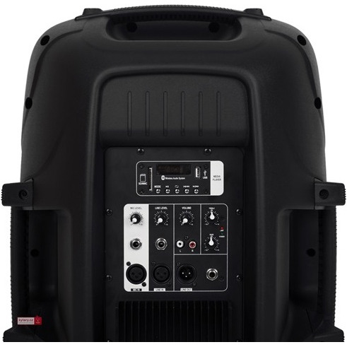 Помимо мультимедиа проигрывателя, на задней панели P110 AUB расположены линейные входы для микрофонов и источников линейного сигнала, каждый из входов оснащен отдельными регуляторами уровня громкости и выполнен на разъемах XLR и джек 6,3 мм. Наличие линейного выхода поможет Вам подключить другую активную акустическую систему.