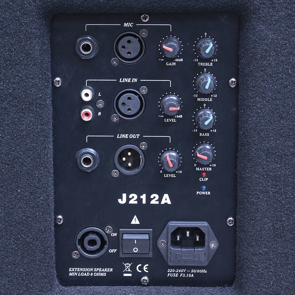 Soundking J212A - активная 2-х полосная акустическая система с корпусом из ДВП, покрытая карпетом. Номинальная выходная мощность 200 Вт. Имеет широкополосный 12" динамик и пьезо твиттер. На задней панели расположены входной разъем XLR(мама) с переключателем входной чувствительности mic/line и выходной разъем XLR(папа) для линкования нескольких систем. Так же имеется регулировки входной чувствительности, эквализация (три полосы), общего выходного уровня, индикатор питания. Возможно подключение дополнительной пассивной АС с минимальной нагрузкой 8 ом (speakon)