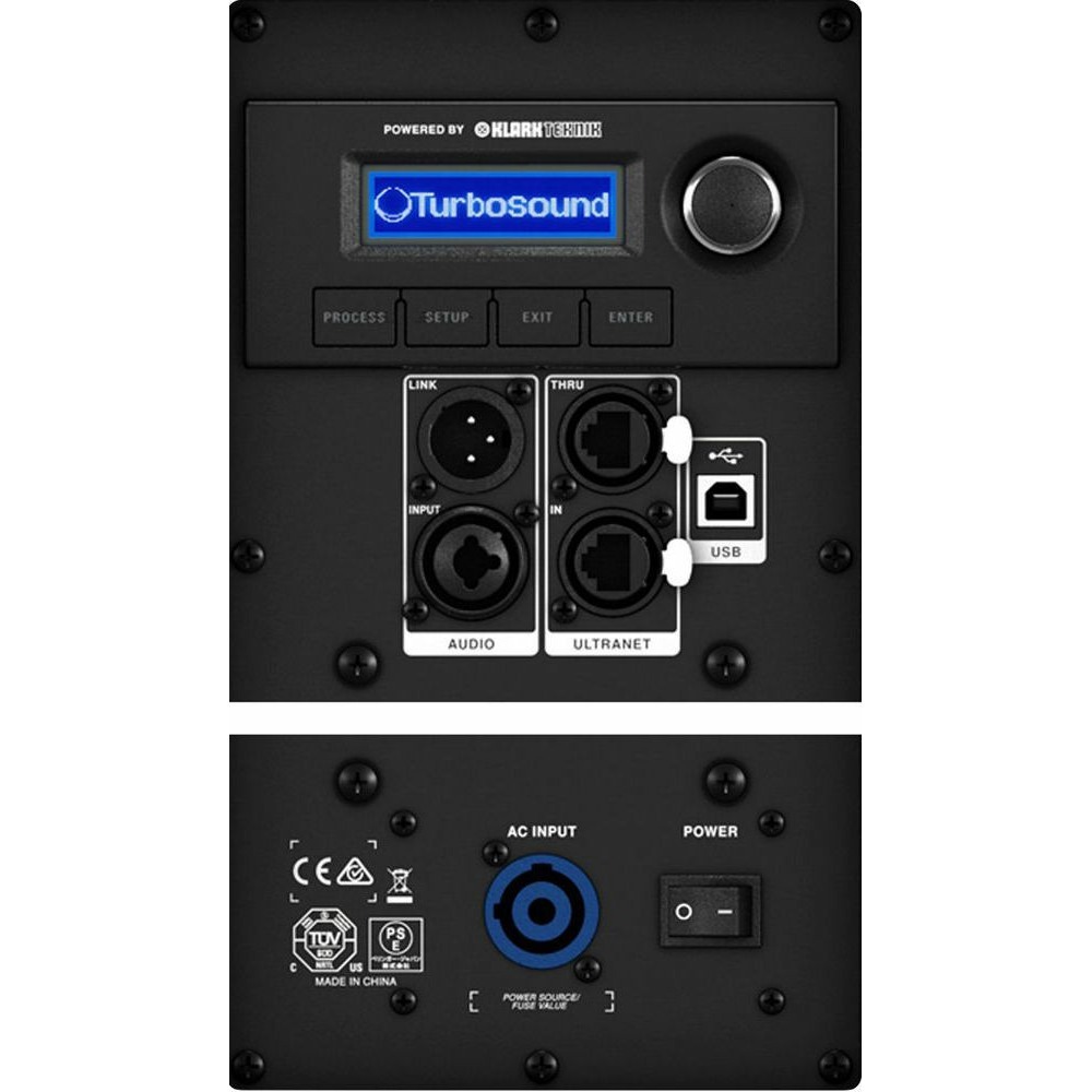 DSP-процессор дает возможность корректировать звучание и контролировать работу АС с помощью активного кроссовера, нескольких эквалайзеров, в том числе двух параметрических и лимитера, который ограничивает пики и защищает динамики от повреждений. Можно сохранять полученные настройки в виде 20 пресетов, также присутствует эффект задержки до 300 мс, который поможет синхронизировать звучание двух колонок, расположенных друг от друга на значительном удалении. Управление функциями происходит с помощью нескольких клавиш на задней панели, а все выбранные значения отображаются на встроенном ЖК-дисплее. Там же располагается вход для подключения источника звука на разъеме Combo Jack/XLR, а также выход Link на разъеме XLR, служащий для коммутации с дополнительным устройством воспроизведения. Есть вход и выход Link, представленные портами RJ45, которые предназначены для интеграции аудиосигнала в цифровой интерфейс Ultranet, способный одновременно передавать до 16 каналов с задержкой менее 0.9 мс. В этом случае аудио передается в формате 24 бит/44.1 или 48 кГц, а частотный диапазон простирается от 20 Гц до 20 кГц.