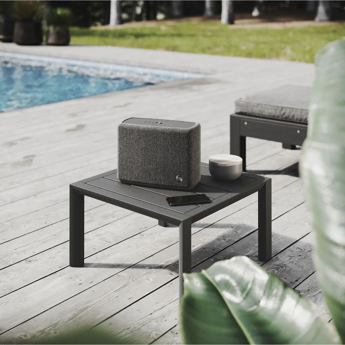 Дизайн. Компактный корпус с акустической тканью, закруглённые края и прочный корпус. Заднее вентиляционное отверстие также служит ручкой для транспортировки.