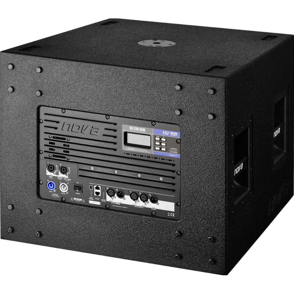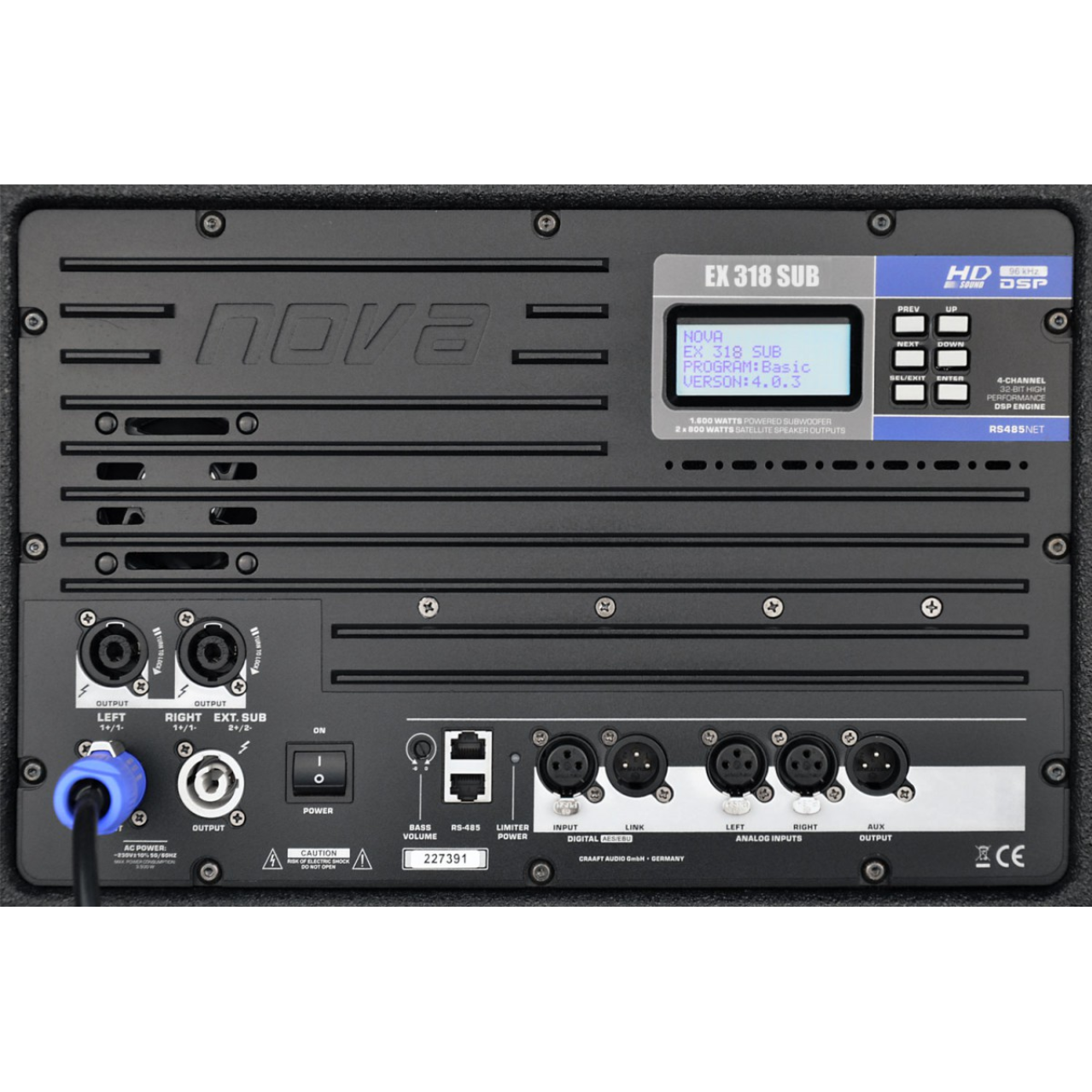 EX318 SUB оснащен встроенным 3-канальным усилителем с импульсным источником питания. Один из каналов (1600 Вт RMS) записывает непосредственно штатный излучатель, а также имеет параллельный выход на дополнительный сабвуфер. Остальные два канала обеспечивают питание для двух сателлитов (2 х 800 Вт RMS). Для обеспечения наилучшего соответствия, параметры каждого выхода можно настроить с помощью встроенного DSP-модуля.