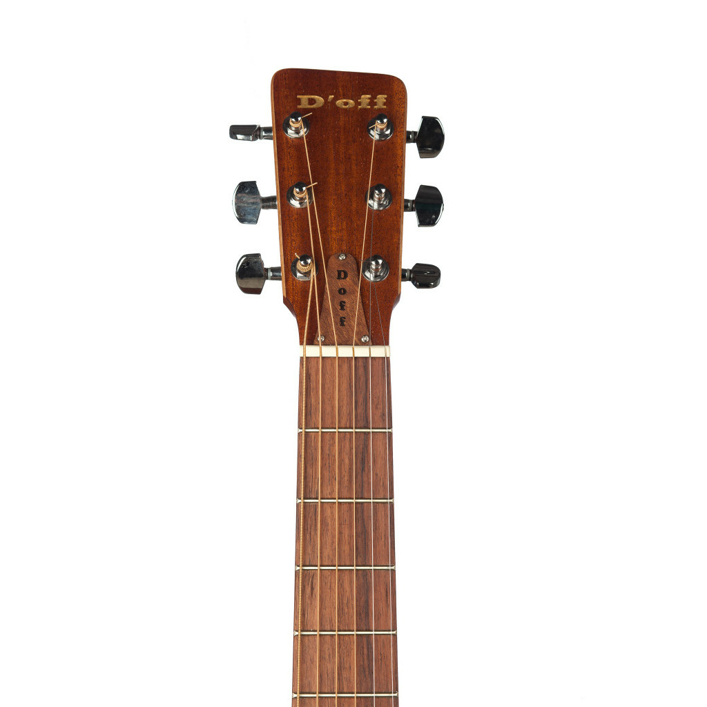 Создавая Folk (народную) гитару инженеры Doff решили обратиться к опыту русских мастеров 19-20 века. Получился очаровательный инструмент совсем не похожий на все остальные гитары, зауженная талия, купол верхней и нижней деки, изящная форма корпуса, но самое главное это звучание, хрустальное, певучее, с красивыми обертонами, так похожими по звучанию на старинную семиструнную гитару.