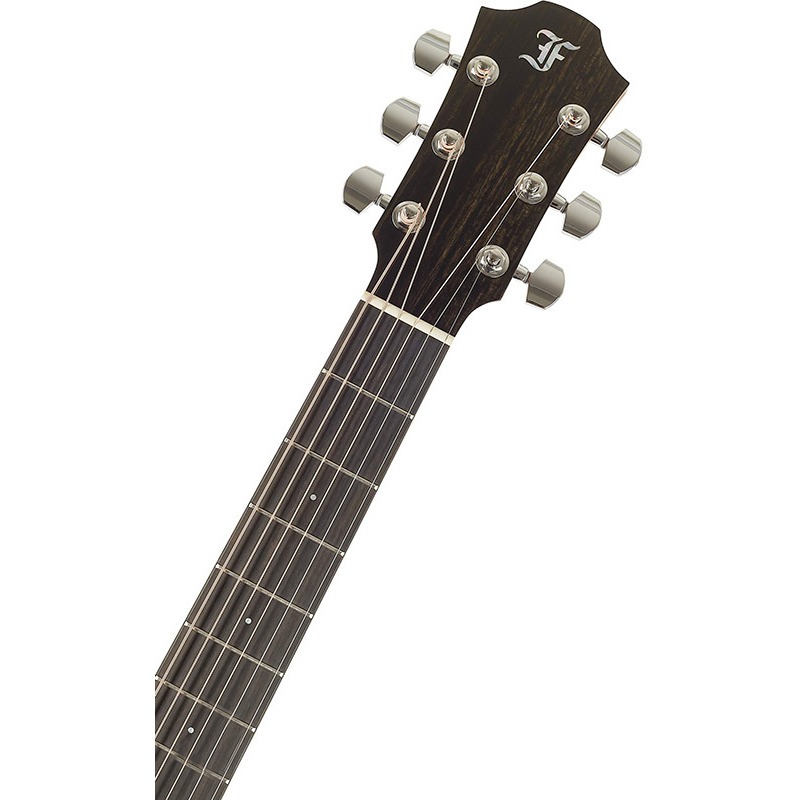 Верхняя дека выполнена из массива ситхинской ели. Нижняя дека и обечайка - из массива африканского красного дерева. Нижняя дека выпуклая, без пружин, что дает дополнительный резонанс. Комбинация древесины, конструктивные особенности, окантовка корпуса из имитации черепахового панциря, контрасный черно-белый пурфинг, розетка из ореха, глянцевое покрытие, все это придает инструменту не только стильный внешний вид, но и прекрасное насыщенное звучание по всему диапазону.