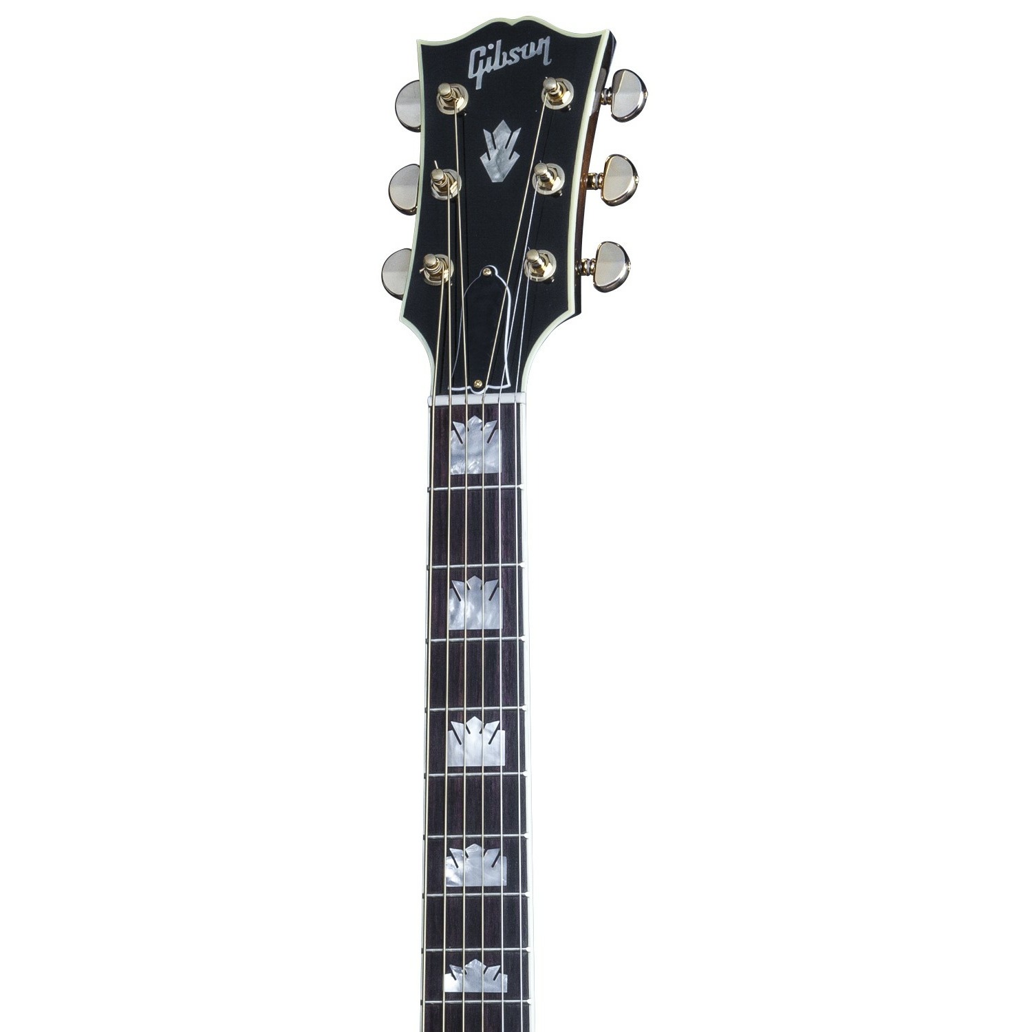 Кленовый гриф с палисандровой накладкой удобно лежит в руках. Края накладки закруглены для более комфортного ощущения. На голове грифа имеется перламутровая вставка в виде короны, маркеры ладов выполнены в виде корон в классическом стиле SJ-200. Колковая механика Gold Grover Rotomatics обеспечивает стабильность строя и дополняет стильный дизайн инструмента.
