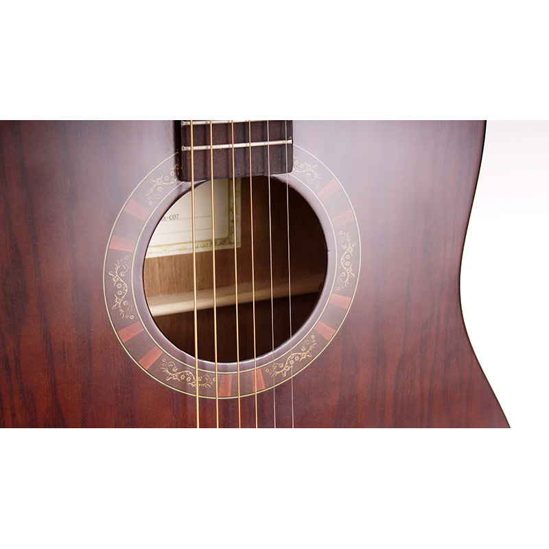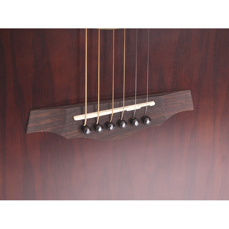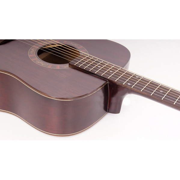 Очень красивая акустическая гитара Вестерн или Дредноут – самый большой и распространенный тип корпуса. Уникальный темно-коричневый цвет модели в матовом исполнении. Верхняя дека сделана из ясени. Задняя дека и обечайка выполнены из катальпы. Гриф изготовлен также из катальпы. Накладка грифа традиционно из палисандра. Гитара сочетает в себе прекрасный дизайн, полноценное звучание и удобство при исполнении. Шикарно звучит как боем, так и перебором. Много богатых обертонов. Такая гитара не оставит равнодушным как новичка – в качестве первой гитары, так и опытного музыканта – для игры дома или на сцене.