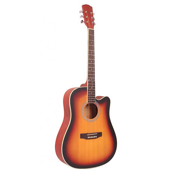 WM-4115-SB - акустическая гитара от компании Mirra. Корпус гитары выполнен в популярной форме дредноут, которая обеспечивает полное и мощное звучание. В корпусе есть вырез для удобного доступа к последним ладам. Верхняя дека инструмента сделана из ели, а нижняя дека и обечайки – из липы. Корпус гитары выполнен в цвете санберст с полуглянцевой отделкой и белой окантовкой из пластика.