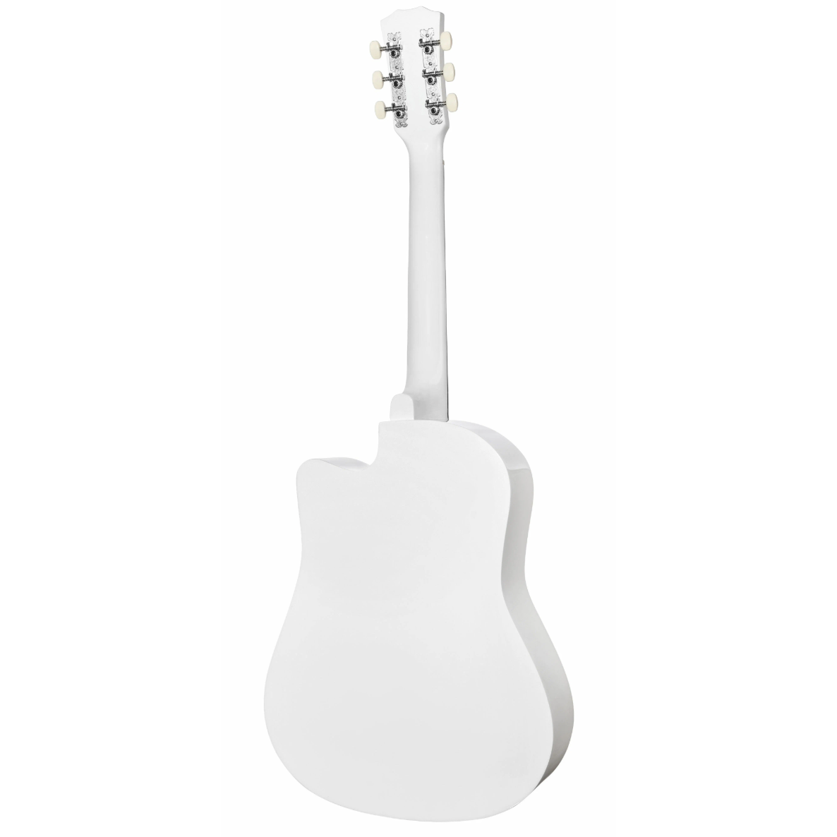 акустическая гитара с корпусом типа фолк и вырезом, окрашенная в белый цвет. Модель ориентирована на правую руку, оснащена металлическими струнами.