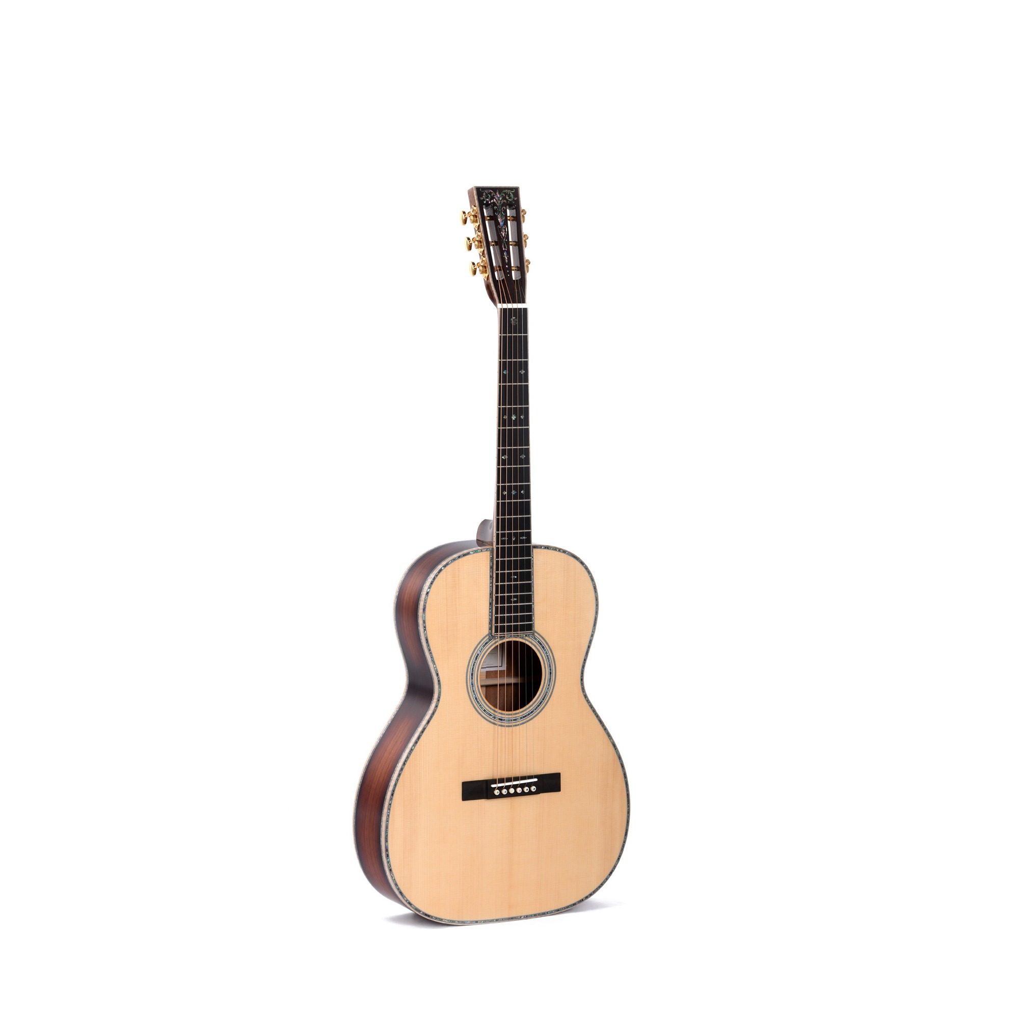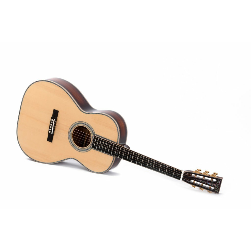 Sigma S000B-45VS+ Limited – ограниченного выпуска до 48 штук акустическая гитара, поставляемая в деревянном кейсе Deluxe класса. Ее уникальность также состоит в компонентах, где из древесины используется только массив, а фурнитура только лучшая. Верхняя дека сделана из уникальной ели – европейской альпийской, корпус из черного дерева Blackwood, а гриф из махагони с наладкой из массива эбони, к которой идеально подогнаны лады. Головка грифа также особенная, она изготовлена из черного дерева и окантована волнистым кленом, плюс украшена инкрустацией. Другие отличительные черты, выделяющие эту гитару, это золотого цвета колки и из натуральной кости порожки. Звучание у нее столь же впечатляющее – яркое и теплое, насыщенное и богатое, резонансное и сбалансированное.