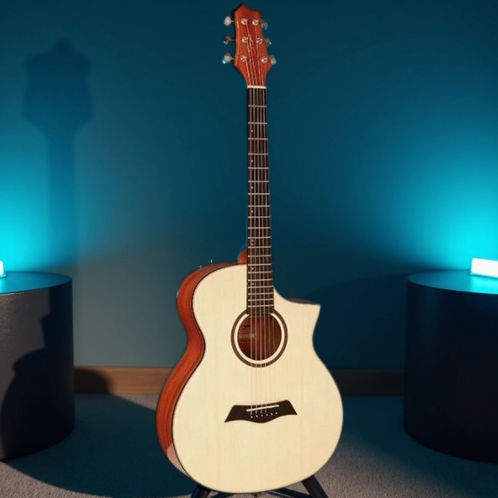 Smiger FN-20 Полноразмерная акустическая гитара начального уровня. Вырез на корпусе улучшает доступ к верхним позициям грифа. Деки и обечайка данной модели выполнены из древесины сапеле, которая отличается малым весом и прочностью, за счет чего гитара обладает ярким и громким звучанием. За настройку и удержание строя отвечает комплект колков Roto-стиля с закрытой механикой. Несмотря на свой ценовой сегмент, гитара великолепно выглядит за счет красивого рисунка древесины и применения окантовки на всех элементах.