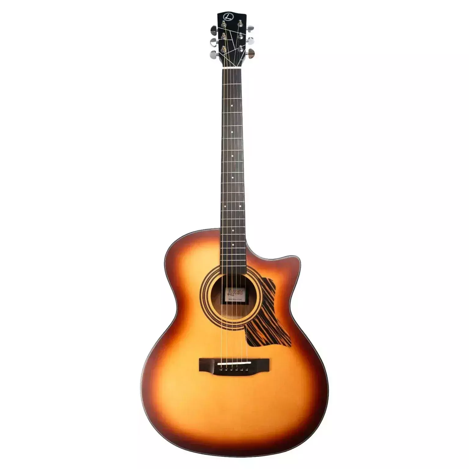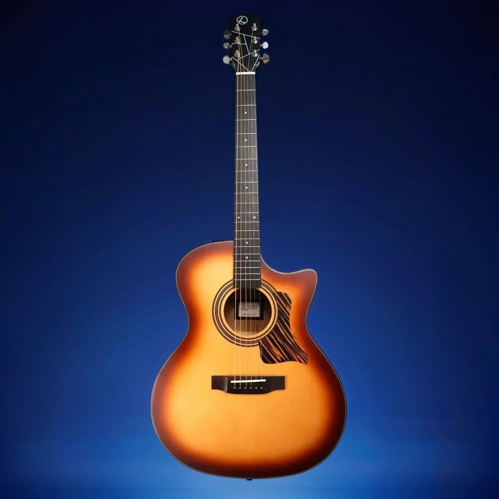 Акустическая гитара с вырезом в цвете «санберст». Инструмент подходит для начинающих и опытных музыкантов благодаря балансу между качеством звука и удобством игры.