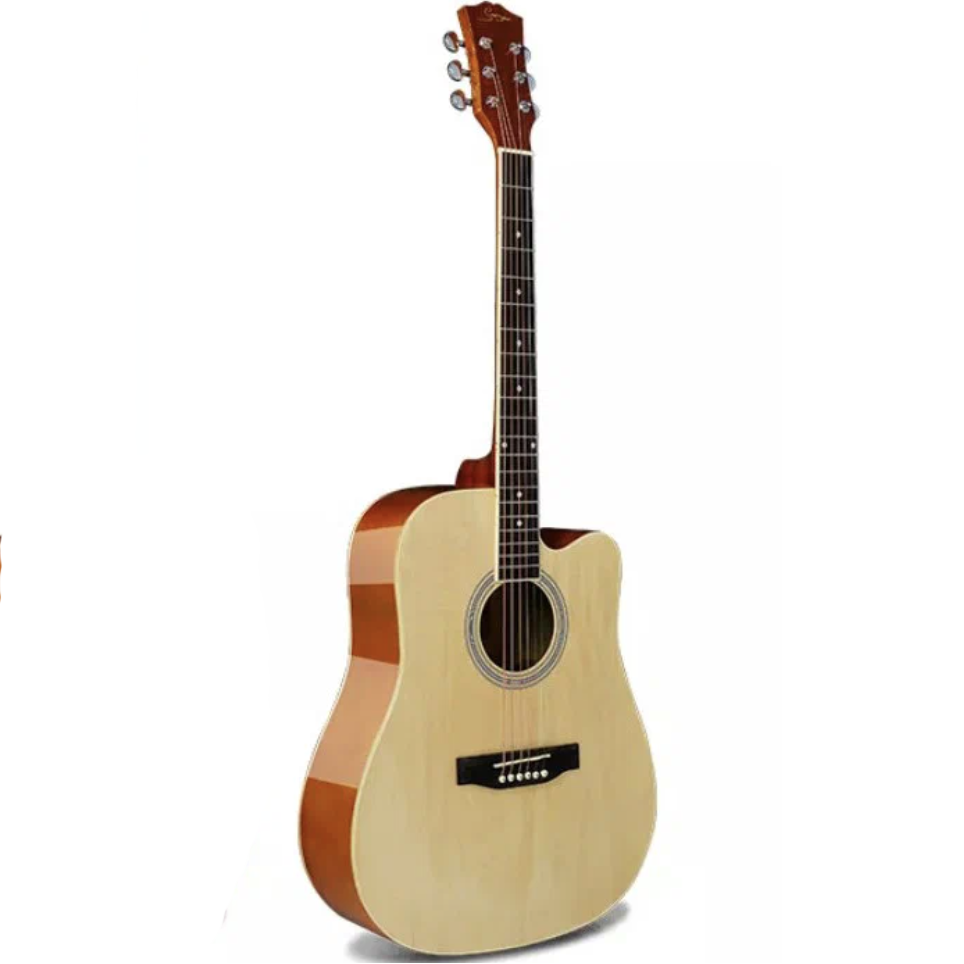 Акустическая гитара с корпусом дредноут и вырезом. Инструмент подходит для начинающих и любителей благодаря сбалансированному звуку и эргономичному дизайну