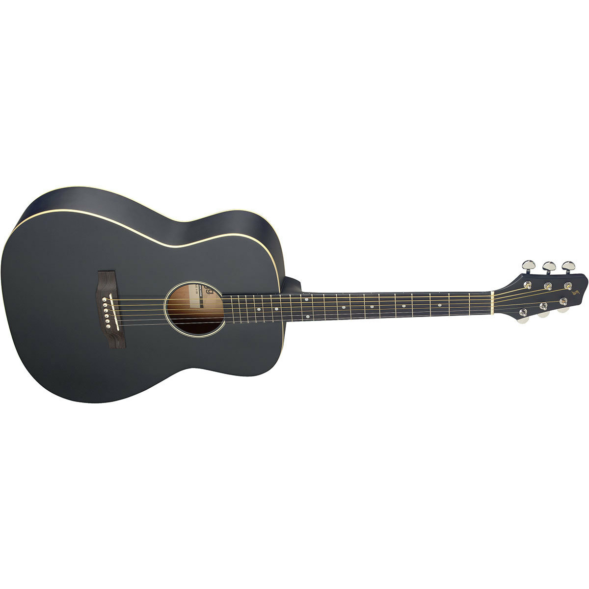 STAGG SA35 A-BK – шестиструнная акустическая гитара в корпусе типа Auditorium черного цвета. Ее верхняя дека выполнена из липы, а вот нижняя дека и обечайки сделаны из экзотического дерева катальпа. Из него же выполнен и гриф, накладка на который сделана из синтетической древесины. Из такой же древесины создан и бридж.