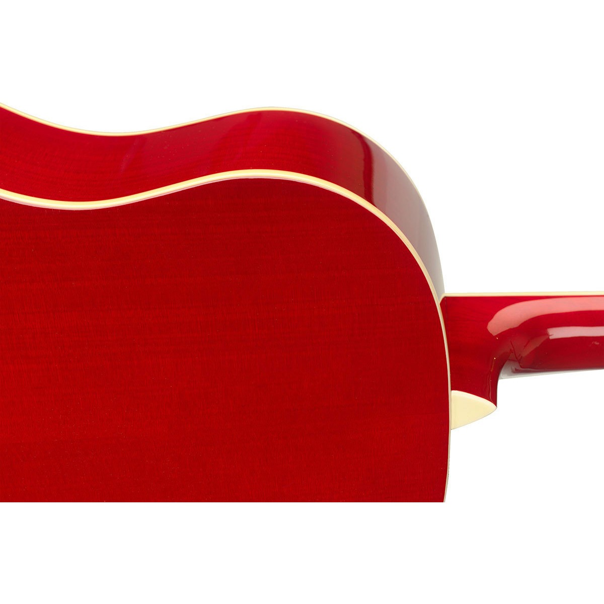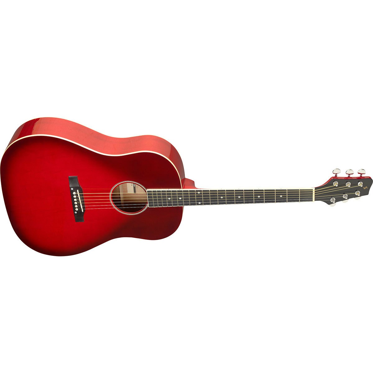 STAGG SA35 DS-TR – шестиструнная акустическая гитара начального уровня в прозрачно-красной глянцевой отделке с наклоном slope shoulder. Тип корпуса гитары – дредноут. Верхняя дека выполнена из липы, нижняя дека и обечайки – из экзотического дерева катальпа, из него же сделан и гриф. Накладка на гриф создана из синтетической древесины. Бридж в гитаре STAGG SA35 DS-TR также сделан из синтетической древесины, нижний порожек выполнен с обычным углом. Кант верхней и нижней деки, а также грифа – белого цвета, что придает гитаре благородный облик в сочетании с прозрачно-красным цветом и глянцевой отделкой. Колковый механизм выполнен никелированным и литым.