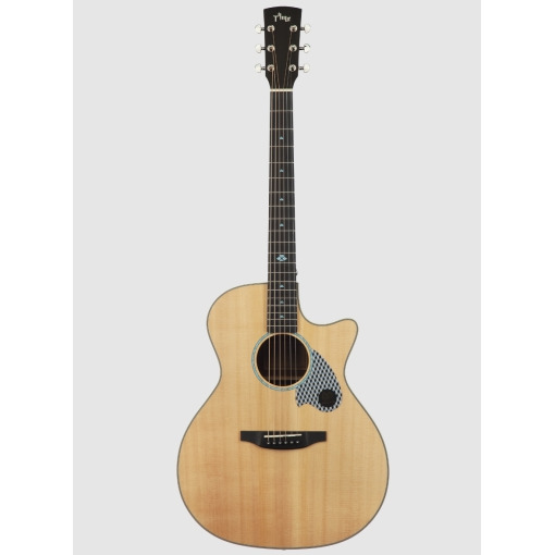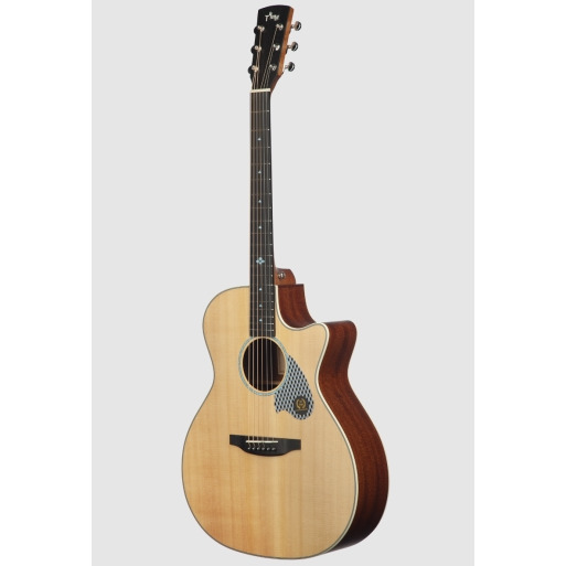 Корпус в форме Гранд Аудиториум обеспечивает объёмное панорамное звучание. Верхняя дека из массива ели, в сочетании с нижней декой и обечайкой из африканского сапеле, формирует мягкий тёплый и сбалансированный звук, отличающийся большим количеством верхних частот.