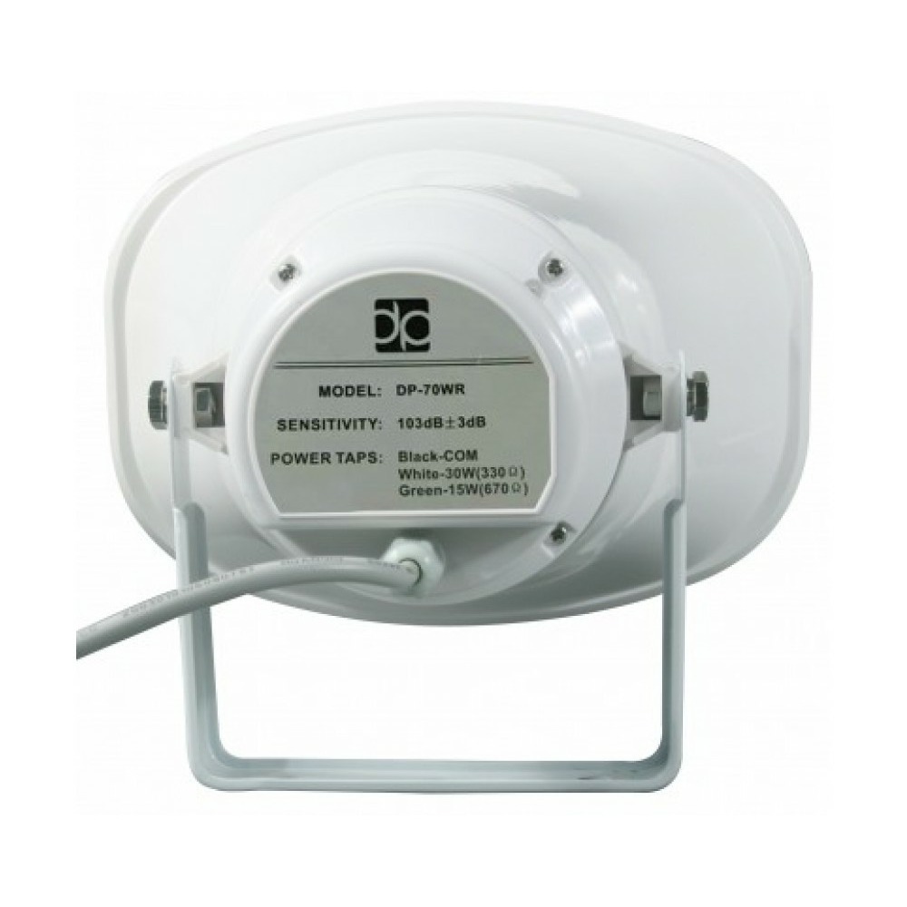 Рупорный водонепроницаемый громкоговоритель DP-70WR оборудован встроенным трансформатором 70 В / 100 В, позволяющим снизить потери аудиосигнала в длинных линиях и облегчить параллельную коммутацию нескольких устройств. Встроенный рупорный динамик обеспечивает воспроизведение сигнала в широком частотном диапазоне от 300 Гц до 13 кГц, а наличие нескольких отводов, 15 Вт и 30 Вт, позволяет адаптировать громкоговоритель к использованию в помещениях с различными габаритами и уровнем окружающего шума.
