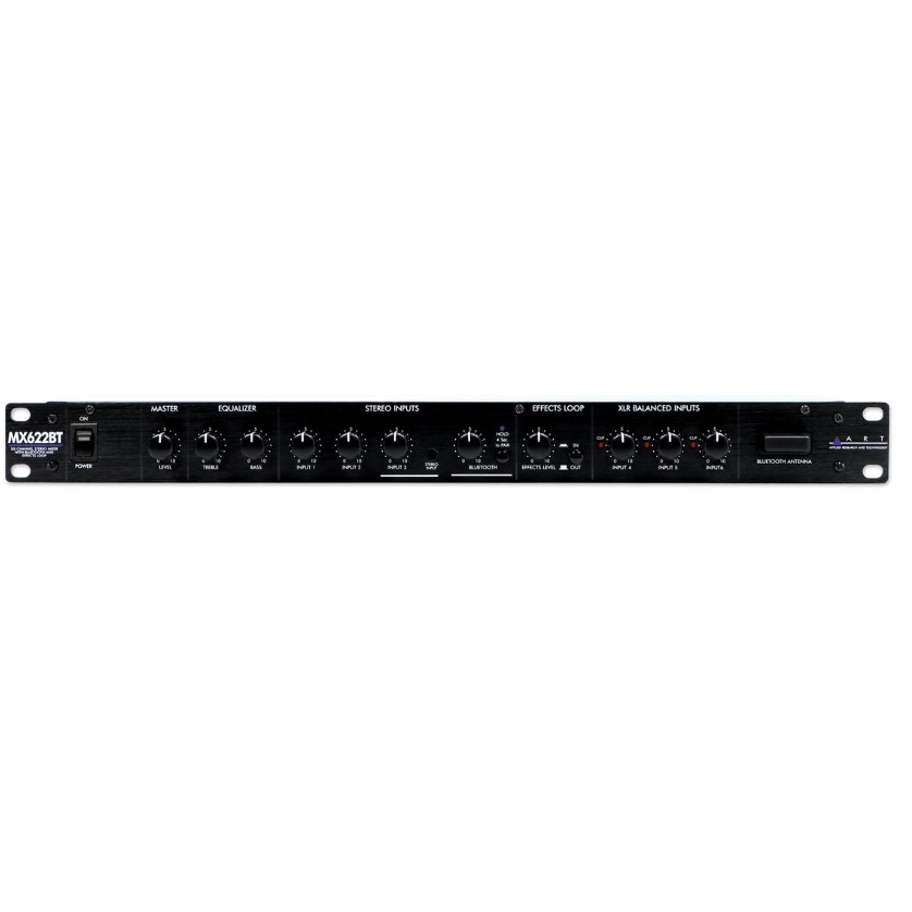 Шестиканальный стереомикшер ART MX622BT с Bluetooth и петлей эффектов - это универсальный микшер для рэковой стойки, объединяющий три балансных микрофонных или линейных входа с тремя линейными стереовходами, а также стереовход Bluetooth в единый стереомикс линейного уровня. Каждый вход XLR имеет полностью регулируемое входное усиление, переключатель микрофон/линия, индикатор перегрузки и фантомное питание 15 В. Три стереовхода линейного уровня имеют подключение через разъемы типа RCA с отдельными регуляторами уровня для каждой стереопары. На передней панели также имеется 1/8-дюймовый вход для портативного аудиоустройства. Вход Bluetooth поддерживает Bluetooth 5.0 и имеет собственный регулятор уровня и переключатель Сопряжение/Вкл/Выкл. Секция петли внешних эффектов обеспечивает моно посыл с трех микрофонных/линейных каналов на внешнее оборудование и стереовозвраты с уровнем эффектов и переключателем входа/выхода. Выходные разъемы RCA стереозаписи обеспечивают постоянный сигнал полного уровня всего микса. Основные выходы - стереобалансные 1/4-дюймовые TRS с общим уровнем и полнодиапазонной коррекцией низких/высоких частот. Встроенный блок питания и возможность установки в рэковую стойку обеспечивают простоту установки и надежную работу.