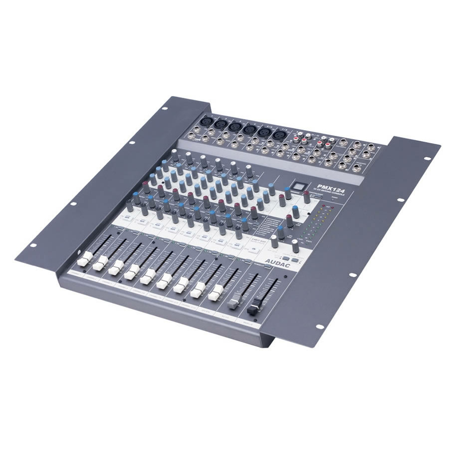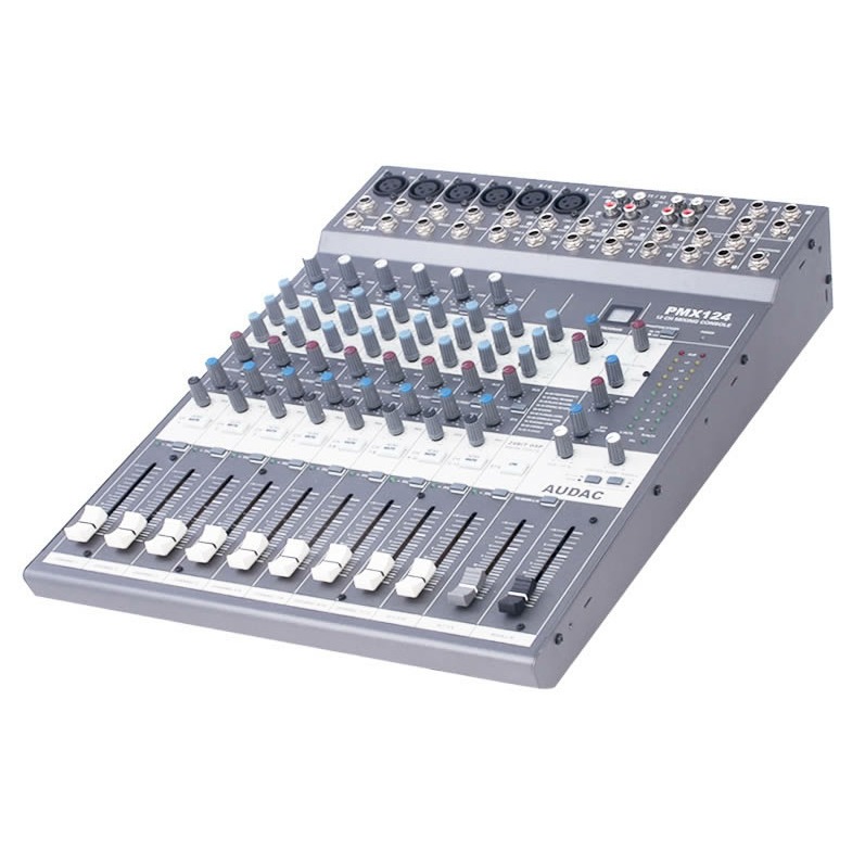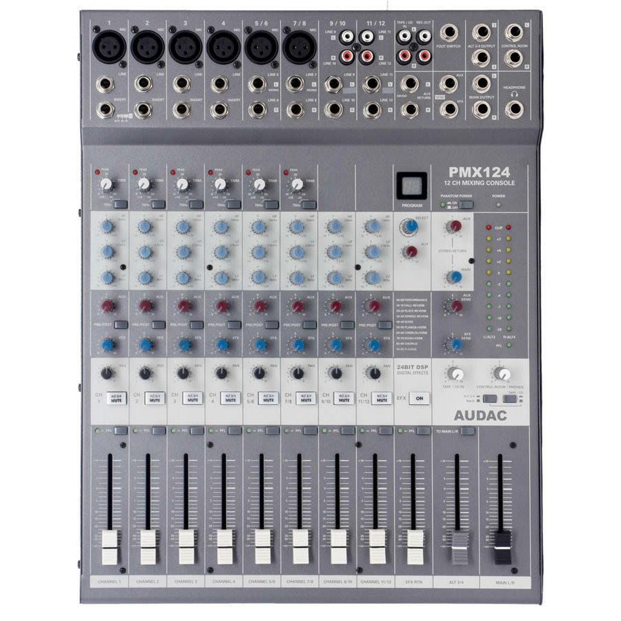 PMX124 – 12-канальный многоцелевой микшер с шестью моно и четырьмя стерео входами. Он предназначен для широкого спектра применений, например, таких как музыкальные группы и ансамбли, в том числе и для стационарных инсталляций. Установленный 24-битный DSP процессор поддерживает 100 запрограммированных высококачественных эффектов, таких как реверберации, задержки, хорус, фленджер и многие другие. Интенсивностью можно управлять стандартной микшерной программой EFX или потенциометром каждого канала. Каждый входной канал оснащен трехдиапазонным эквалайзером, а каналы 1 – 7/8 имеют фильтры ВЧ. Кроме этого, каждый канал оснащен переключателями включения предмикшерного контроля и выключения звука, а два линейных индикатора высокого разрешения показывают уровень основных выходных сигналов. На все микрофонные входы подведено фантомное питание 48 В для обеспечения работы конденсаторных микрофонов. Микшер поставляется с кронштейнами для монтажа в 19” стойку и имеет высоту 10U.