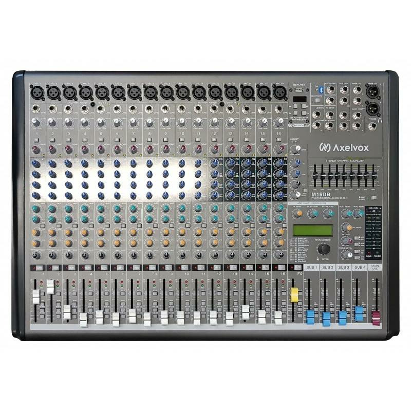 Axelvox M16DB аналоговый микшерный пульт, предлагающий широкий функционал микширования. Например, микширование FOH, мониторинга и матрицы входов (16 микрофонных/16 линейных входов). Кроме того, имеется графический эквалайзер на девять полос, процессор эффектов, проигрыватель USB и модуль Bluetooth для воспроизведения музыки с портативных устройств. Корпус прочный и компактный, что делает микшер подходящим звукорежиссерам, которым нужна профессиональная модель небольшого размера и с большими возможностями.
