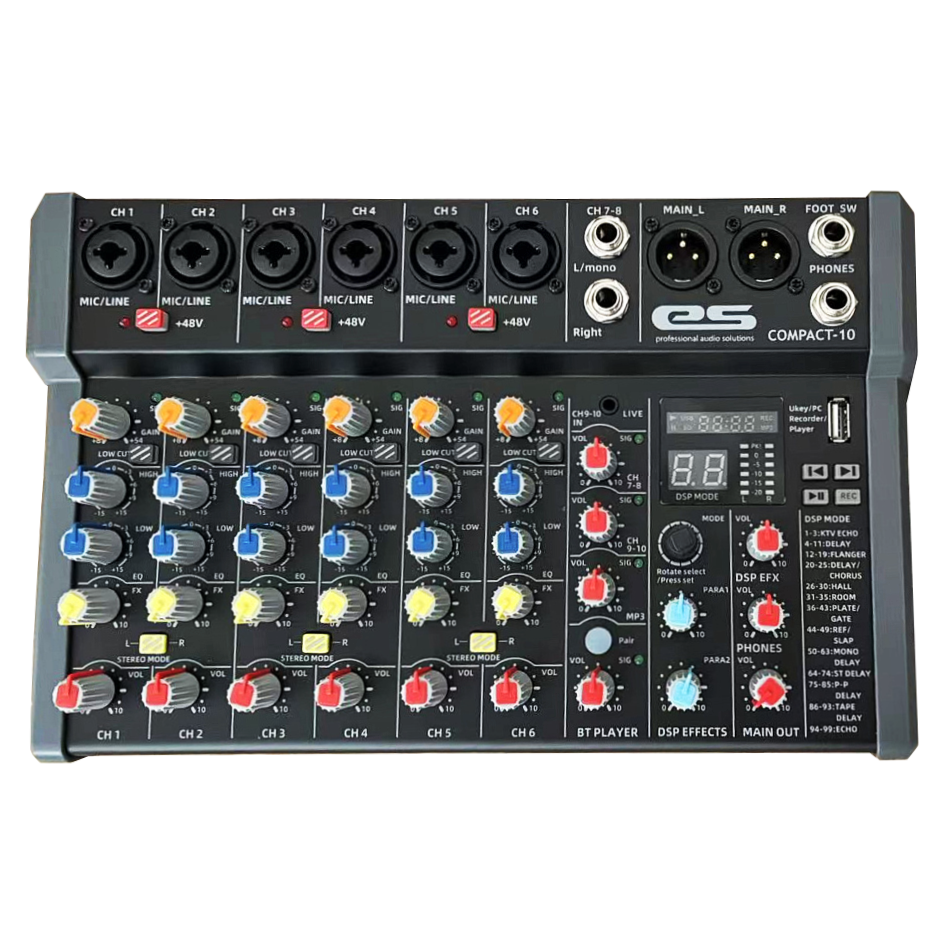 Это 10-канальный аналоговый микшерный пульт, предназначенный для смешивания аудиосигналов. Он подходит для домашнего использования, конференц-залов, баров и небольших мероприятий.