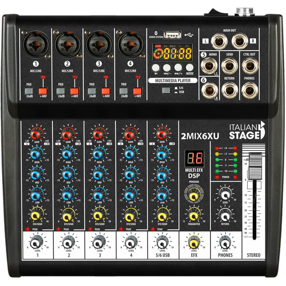 Italian Stage 2MIX6XU - это компактный микшерный пульт с набором всего необходимого для музыканта. В том числе, он обладает чистым звуком, благодаря малошумящим предусилителям, установленным на борту.