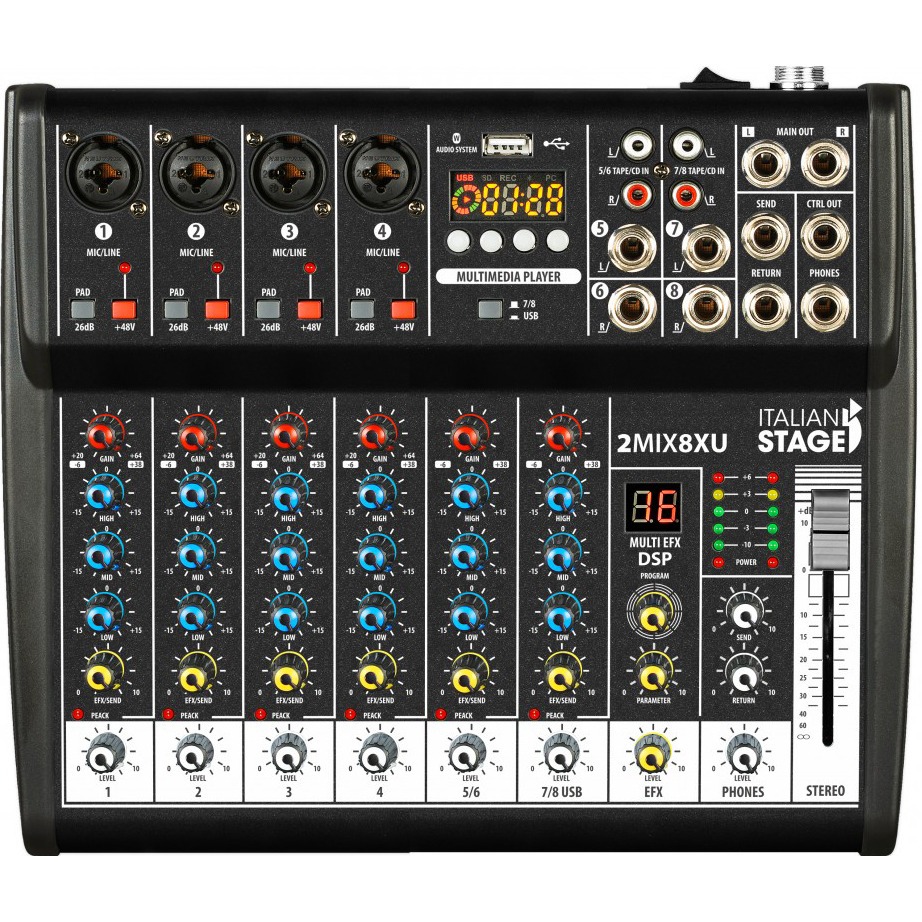 Italian Stage 2MIX8XU - это компактный микшерный пульт с набором всего необходимого для музыканта. В том числе, он обладает чистым звуком, благодаря малошумящим предусилителям, установленным на борту.