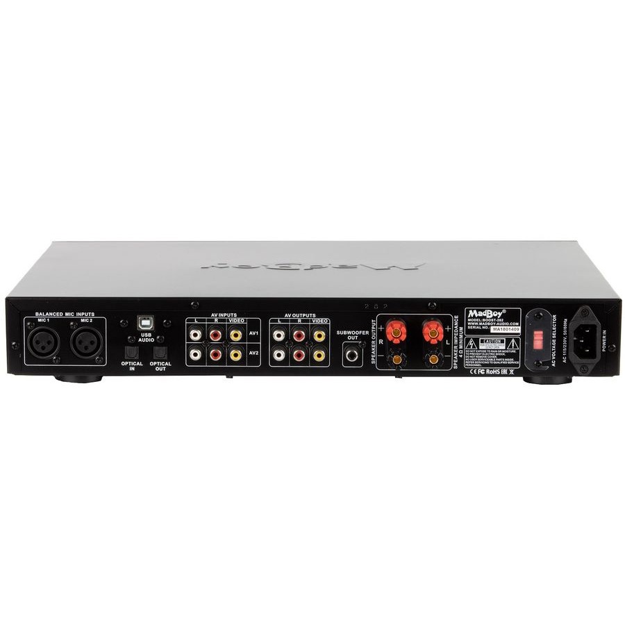 Конструкция BOOST-202 предусматривает отдельный выход для сабвуфера, что позволяет подключать активный бас в качестве элемента акустической системы, не прибегая к различным трюкам. Одной из особенностей устройства являются сбалансированные микрофонные входы 6.3 мм TRS. Для подключения микрофонов Вы можете использовать симметричные штепсельные кабели, что обеспечит чистый и мягкий звук.