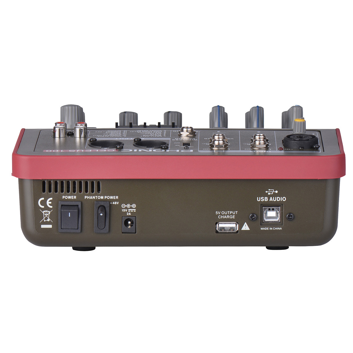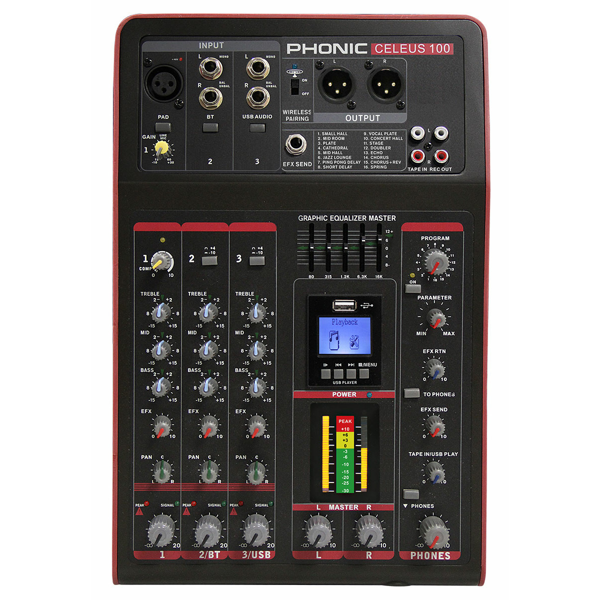 Phonic CELEUS 100 - 5-ти канальный микшерный пульт, 1 моно/микр вход, 2 стерео/лин. вх., USB плеер/рекордер, Bluetooth стримминг, воспроизведение аудио с вашего смартфона, планшета, USB выход для зарядки мобильных устройств, USB аудиоинтерфейс.
