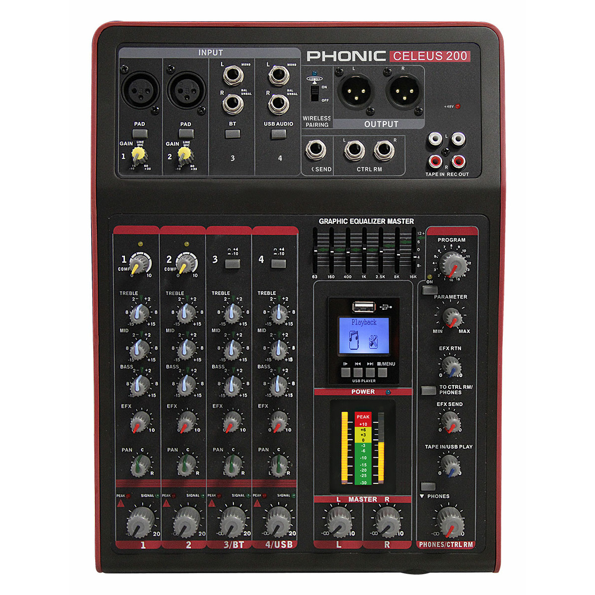 Phonic CELEUS 200 - 6-ти канальный микшерный пульт, 2 моно/микр входа, 2 стерео/лин. вх, USB плеер/рекордер, Bluetooth стримминг, воспроизведение аудио с вашего смартфона, планшета, XLR разъёмы на мастер выходе, USB аудиоинтерфейс.