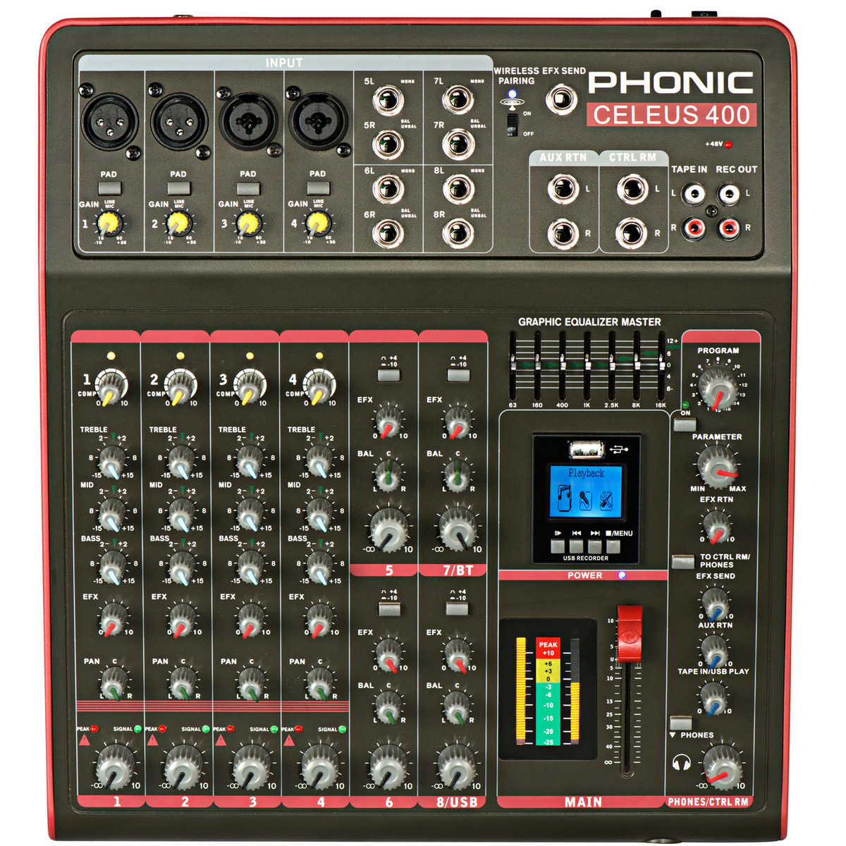 Phonic CELEUS 400 - 12-ти канальный микшерный пульт, 4 моно/микр вх., 4 стерео/лин. вх., USB плеер/рекордер, Bluetooth стримминг, воспроизведение аудио с вашего смартфона, планшета, XLR разъёмы на мастер выходе, USB аудиоинтерфейс.