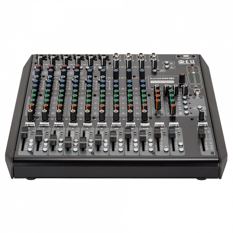 RCF E12 представляет собой 12-канальный микшерный пульт с высококлассными эффектами и эквалайзерами. Данная модель предоставляет шесть микрофонных предусилителей студийного качества с запасом гейна до 54 дБ и комбинированными разъемами. Два линейных входа могут переключаться в режим Hi-Z. Входная секция также оснащена тремя стерео линейными входами и стерео возвратом. Входные каналы с 1 по 4 имеют компрессор с одним регулятором. Для каждого из шести моно каналов предусмотрен 3-полосный эквалайзер, включая регуляторы высоких, низких частот, а также полупараметрическую среднюю полосу с возможностью выбора частоты. Входные стерео каналы имеют обычный трехполосный эквалайзер.