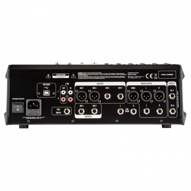 Задняя панель микшерного пульта RCF E12 обладает большим количеством разъемов для подключения дополнительного звукового оборудования. Здесь вы сможете найти два вспомогательных выхода AUX на разъемах XLR и два на разъемах 1/4" Jack, стерео входы/выходы RCA, два 1/4" Jack инсерта для каналов 5 и 6, две выходные шины с разъемами 1/4" Jack, вход для ножного переключателя, два выхода CTRL Room 1/4" Jack, а также главные моно/стерео выходы на разъемах XLR и 1/4" Jack. Дополнительно присутствует порт USB Audio Type B.