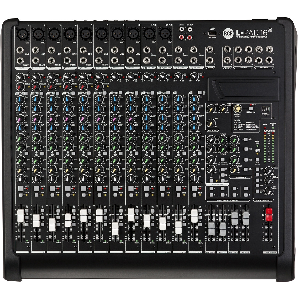 RCF L-PAD 16CX USB - 16х-канальный аналоговый микшер, обладает хорошим соотношением цены/качества, компактен и прост. Прозрачность звучания, элегантный дизайн, прекрасно себя зарекомендует на концертах, конференциях, презентациях. Особенности: 10 микрофонных входов, 4 стерео входа, 3 AUX, 1 FX посыл, процессор эффектов, компрессор на 6 микрофонных входах, 3-полосн. полупараметр./4-полосн. EQ, USB интерфейс, 4 подгруппы, внутренний БП. Слот для интеллектуальной карты.