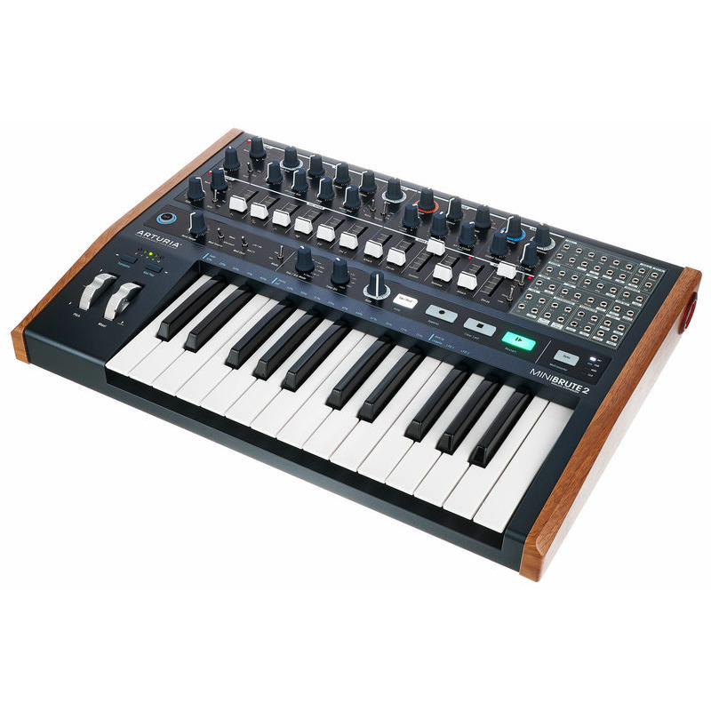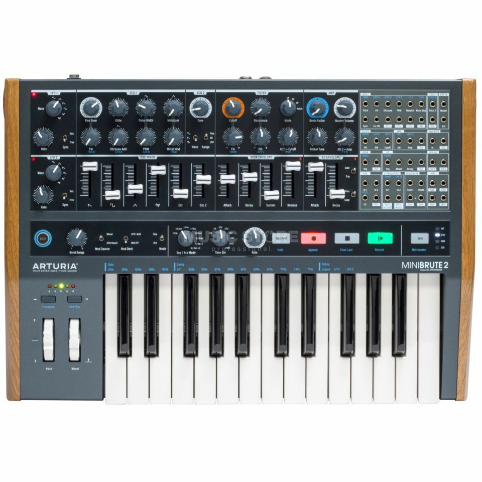 Arturia Minibrute 2 — это новый монофонический аналоговый синтезатор от Arturia, обновленная концепция ставшего живой классикой первого Minibrute синтезатора. При сохранившихся компактных размерах, в новую версию был добавлен ряд улучшений и новый функций. Синтезатор теперь оснащен чувствительной к скорости нажатия 25-ти клавишной клавиатурой, которая способна воспринимать послекасание. Эта технология заимствована из главного синтезаторного флагмана Arturia MatrixBrute. Также синтезатор теперь включает два модуля LFO, пару конвертеров(ADSR и AD), новейший многорежимный фильтр Штейнера-Паркера, улучшенный арпеджиатор/секвенсор и частотную модуляцию. Однако самым богатым на возможности нововведением является 48-ми слотовый patchbay, который совместим с Eurorack. Таким образом в лице Arturia MiniBrute 2 вы получаете в свое распоряжение полумодульную систему, которая способна взаимодействовать с очень широким спектром других инструментов.