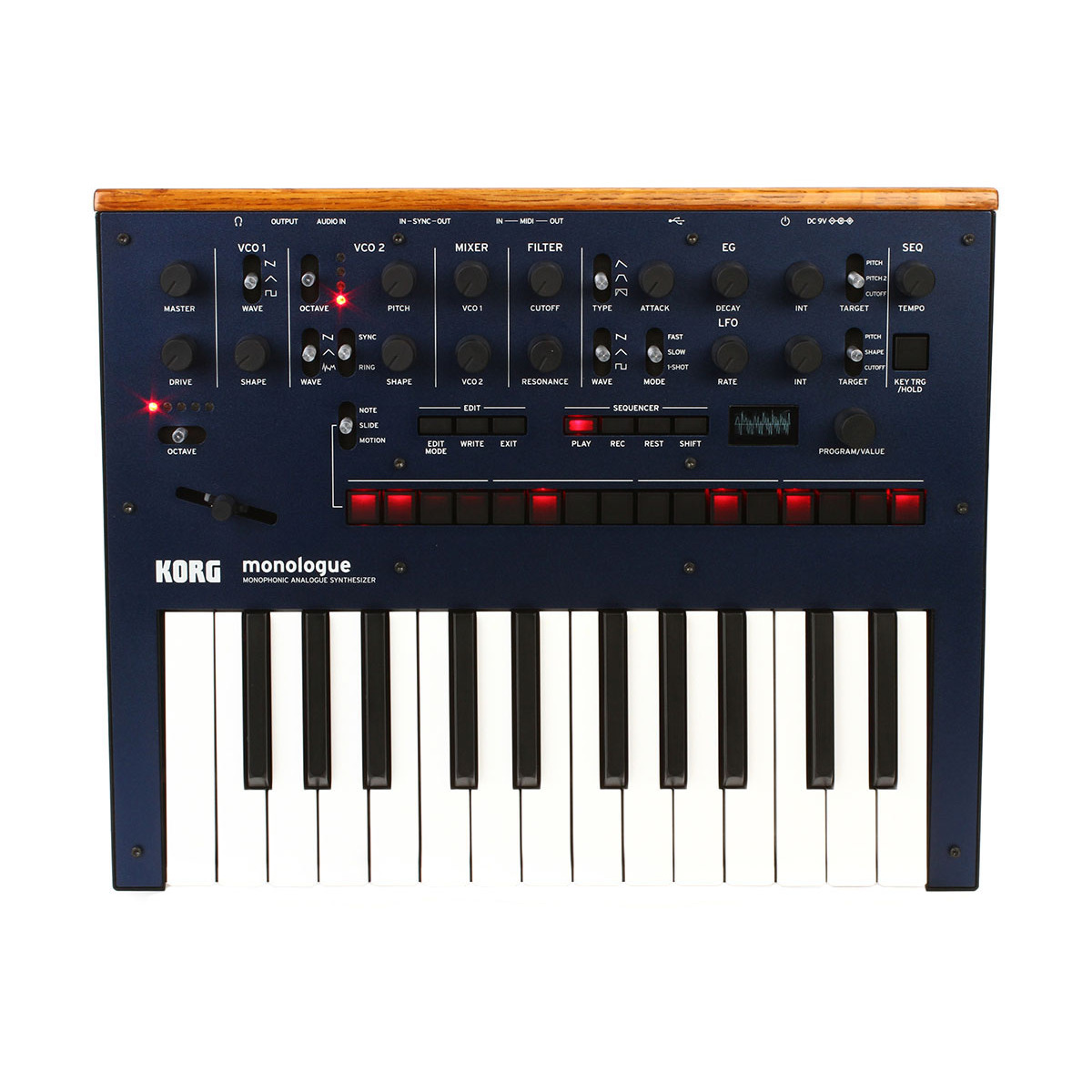 KORG MONOLOGUE-BL синтезатор высокопроизводительный, красивый и элегантный аналоговый синтезатор от знаменитой японской компании. Это полностью программируемый монофонический синтезатор нового поколения. В конструкции MONOLOGUE используются те же технологии, что в знаменитой модели Minilogue. 25-клавишный синтезатор получил обновлённое звучание и ряд современных функций, позволивших сделать модель в полной мере универсальной, подходящий для музыкантов разного уровня мастерства, играющих в разных стилях. Возможно сохранение в памяти до 100 программ (80 предустановленных и 20 пользовательских). Высокопроизводительный шестнадцатишаговый секвенсор, два осциллятора, широкий выбор фильтров, 32 установки тонкой настройки, 23 отдельных элемента управления на панели, работающий в режиме реального времени светодиодный осциллоскоп и многие другие полезные функции делают синтезатор KORG MONOLOGUE действительно многофункциональным устройством. Возможности коммутации предусматривают аудио входы и выходы 1/4 джек, разъемы Sync In и Out (мини-джек), вход и выход MIDI, разъем для подключения наушников и порт USB. Компактные размеры синтезатора и его небольшой вес (всего 1,7 кг) позволяют легко брать его с собой в туры и поездки. Это в полной мере портативная модель, которая может работать как от сетевого адаптера (в комплекте), так и от 6 батарей АА, её удобно использовать на выездных мероприятиях и выступлениях. Срок работы от батарей – 6-8 часов. Представленная модель – синего цвета.