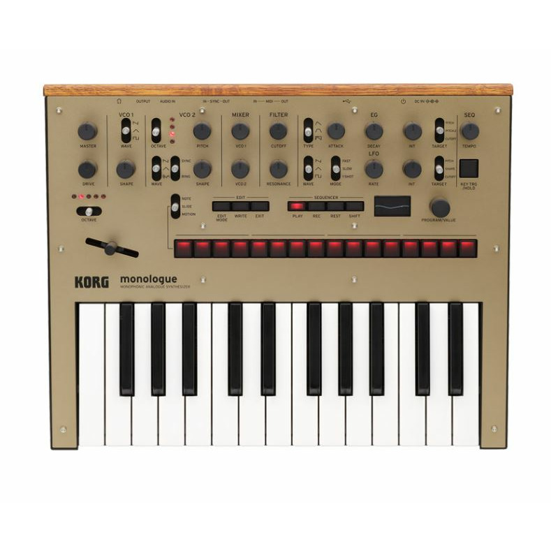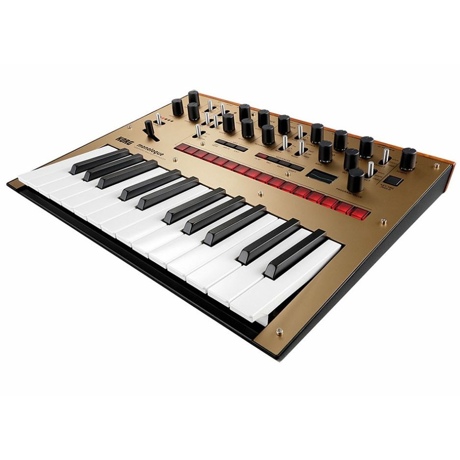 KORG MONOLOGUE-GD синтезатор высокопроизводительный, красивый и элегантный аналоговый синтезатор от знаменитой японской компании. Это полностью программируемый монофонический синтезатор нового поколения. В конструкции MONOLOGUE используются те же технологии, что в знаменитой модели Minilogue. 25-клавишный синтезатор получил обновлённое звучание и ряд современных функций, позволивших сделать модель в полной мере универсальной, подходящий для музыкантов разного уровня мастерства, играющих в разных стилях. Возможно сохранение в памяти до 100 программ (80 предустановленных и 20 пользовательских). Высокопроизводительный шестнадцатишаговый секвенсор, два осциллятора, широкий выбор фильтров, 32 установки тонкой настройки, 23 отдельных элемента управления на панели, работающий в режиме реального времени светодиодный осциллоскоп и многие другие полезные функции делают синтезатор KORG MONOLOGUE действительно многофункциональным устройством. Возможности коммутации предусматривают аудио входы и выходы 1/4 джек, разъемы Sync In и Out (мини-джек), вход и выход MIDI, разъем для подключения наушников и порт USB. Компактные размеры синтезатора и его небольшой вес (всего 1,7 кг) позволяют легко брать его с собой в туры и поездки. Это в полной мере портативная модель, которая может работать как от сетевого адаптера (в комплекте), так и от 6 батарей АА, её удобно использовать на выездных мероприятиях и выступлениях. Срок работы от батарей – 6-8 часов. Представленная модель – золотого цвета.