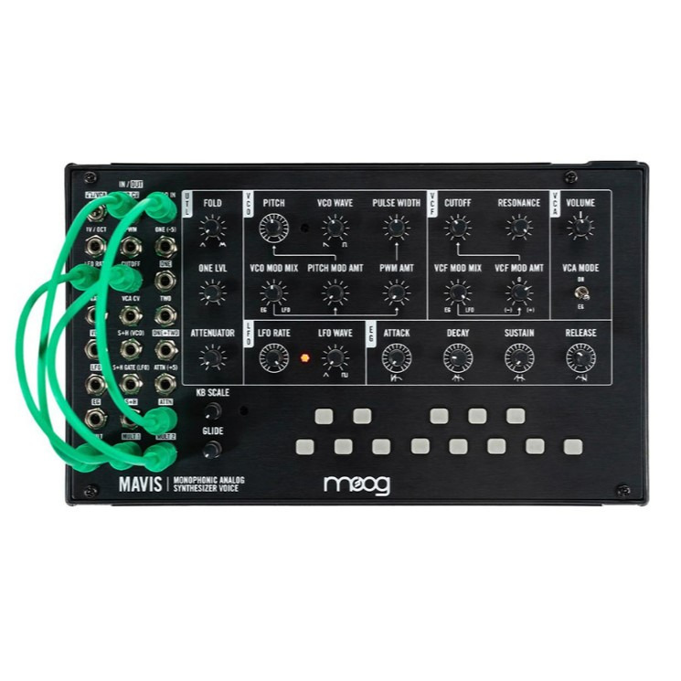 Moog Mavis — полумодульный аналоговый монофонический синтезатор. Поставляется в виде комплекта для самостоятельной сборки, пайка е требуется. Оснащен осциллятором с функцией плавного изменения формы волны — от пилообразной до квадратной с широтно-импульсной модуляцией. Фирменный лестничный фильтр 24 дБ/окт позволяет добиться характерного саунда. Фильтр, VCO и VCA можно модулировать отдельно при помощи LFO с переменной формой волны и огибающей ADSR. Кроссфейдеры в маршрутизации модуляции позволяют смешивать сигнал LFO и генератора огибающей и получить необычные контуры модуляции. VCA оснащен режимом воспроизведения дрон-сигнала.