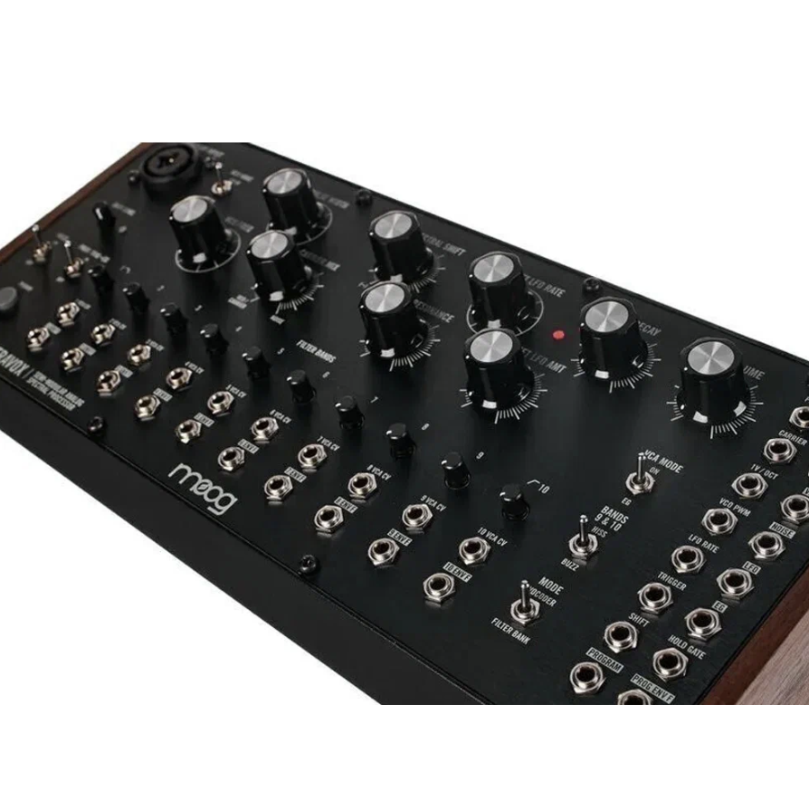 Spectravox — это уникальный инструмент в линейке Moog, который переосмысляет концепцию аналоговой спектральной обработки. В его основе лежит 10-полосный фильтр-банк (8 полосовых фильтров, ФНЧ и ФВЧ), который анализирует внешний сигнал, поданный на вход программы (например, голос), и накладывает его спектральный профиль на внутренний генератор или внешнюю несущую (синтезатор, драм-машину). Результат — классический эффект «роботизированного» голоса, но также и гораздо более сложные звуковые ландшафты: от мерцающих фильтрованных текстур до плотных, движущихся падсов и ритмических пульсаций.