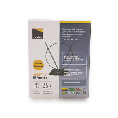 TESLER IDP-110 это компактная комнатная антенна которая станет отличным решением для тех, кто хочет настроить цифровое телевидение в жилом доме, расположенном в непосредственной близости от цифрового телепередатчика. Модель относится к классу пассивных антенн и имеет скромное усиление в 2-3 дБ. Модель имеет телескопические дефлекторы, которые имеют регулируемую длину и угол наклона - такая конструкция позволит расположить антенну в непосредственном направлении к сигналу. Работает антенна от цифровой приставки или телевизора.
