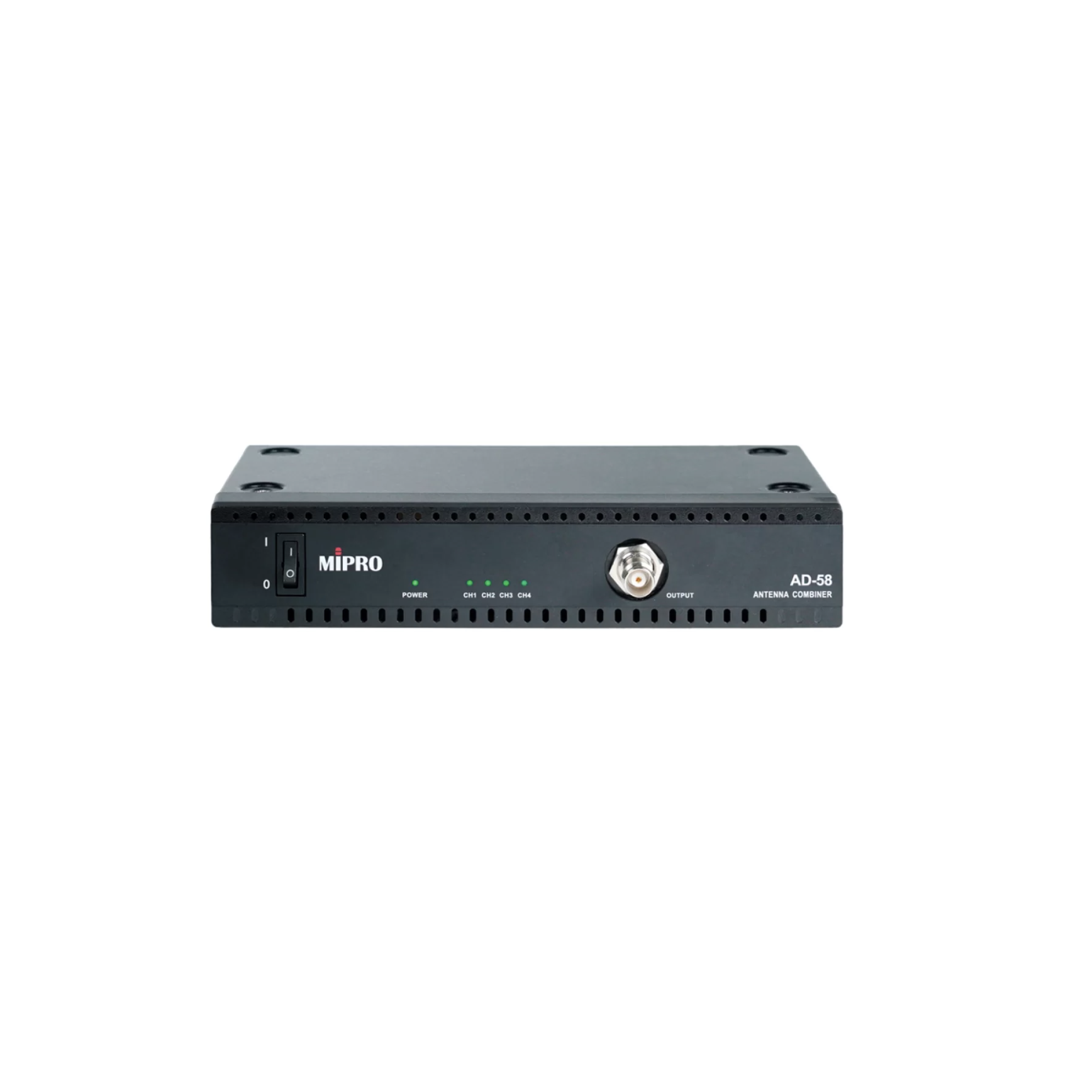 Mipro AD-58 предназначен для комбинированной передачи одной антенной сигнала от двух до четырёх передатчиков системы персонального ушного мониторинга MiPRO MI-58T/MI-58TD 5.8 ГГц. Комбайнер помогает организовать стабильную и качественную работу радиосистемы, минимизируя потери сигнала и снижая искажения.