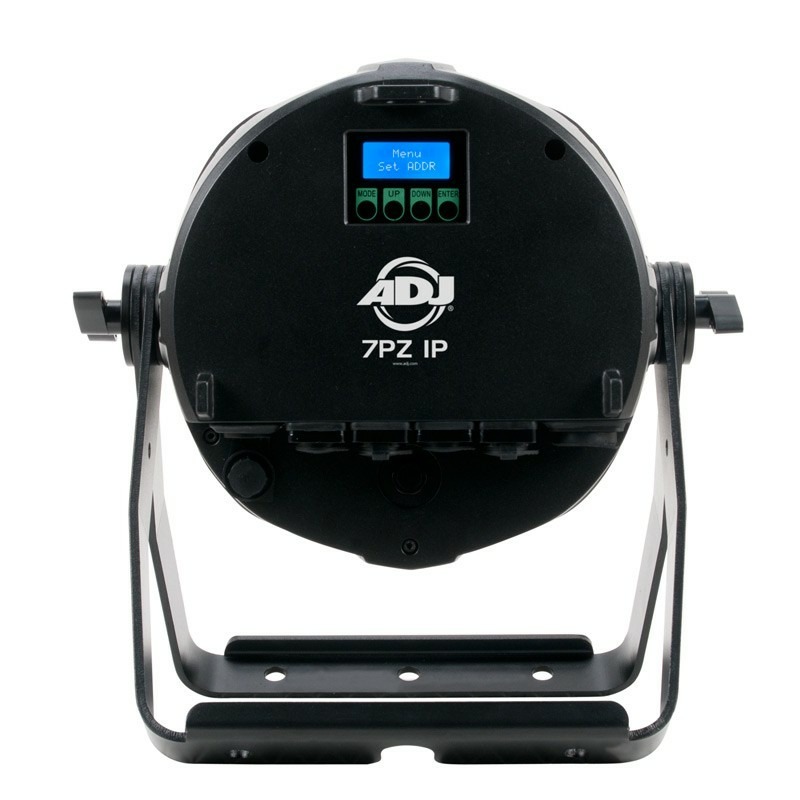 ADJ 7PZ IP включает 7 четырехцветных светодиодов (4-в-1 RGBW) мощностью 15 Вт с 64 встроенными цветовыми макросами. Устройство предлагает 5 кривых затемнения и плавную электронную регулировку яркости 0–100%. Благодаря 5 режимам работы, 4 режимам DMX-каналов и 4-кнопочному меню с функциональным дисплеем устройство 7PZ IP предлагает широкий спектр возможностей управления. Диапазон зума составляет 7–45°.