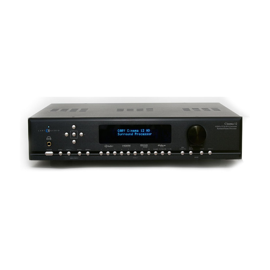 В Cary Audio Design Cinema 12 имеются точная система автокалибровки окружающего звучания с помощью прецизионного измерительного микрофона, регулировка тембра звука в области высоких и низких частот, система управления басами с использованием регулируемого (в пределах 40 – 140 Гц с шагом 10 Гц) входного фильтра. Аппарат можно использовать для создания мультирумных систем, Cinema 12 оснащен балансными и однополярными 7.1-выходами, 7.1-канальным входом для прямого подключения к SACD-проигрывателям, выходом на наушники, разъемом RS232, входами для внешних ИК-датчиков, управляющими триггерными выходами. Аппарат комплектуется великолепным пультом ДУ с ЖК-дисплеем, очень удобным в работе, с помощью которого можно управлять самой серьезной AV-системой. Все аудиосхемы процессора изготовлены столь же тщательно, как и традиционная стереокомпоненты фирмы Cary Audio, поэтому звучание Cinema 12 понравится и поклоннику современных блокбастеров, и самому требовательному меломану.