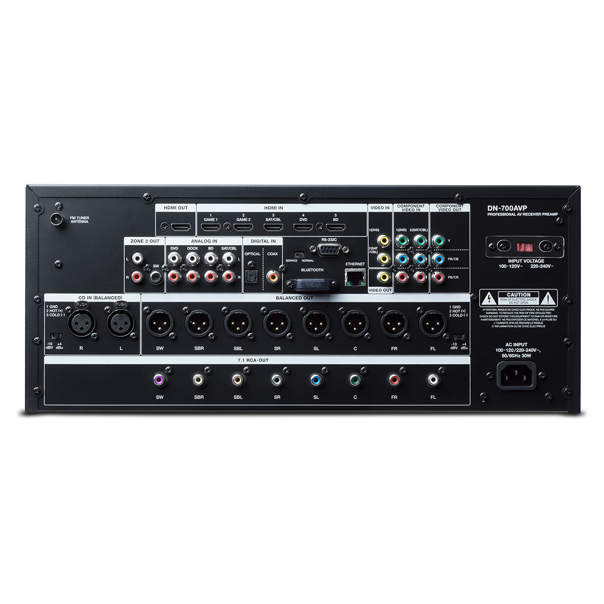 Denon DN-700AVP рассчитан на подключение внешнего 7-канального усилителя мощности и для этой цели в нем предусмотрены балансные и небалансные выходы. Таким образом, появляется возможность использование для подключения длинных соединительных кабелей без внесения в сигнал дополнительных шумов и искажений. Аппарат оснащен шестью HDMI-входами (один из которых находится на передней панели) и одним выходом, оптическим и коаксиальным входами, а также возможностью подключения четырех аналоговых источников линейного сигнала. Также в процессоре предусмотрен фронтальный USB-разъем для подключения флешек с музыкальными файлами.